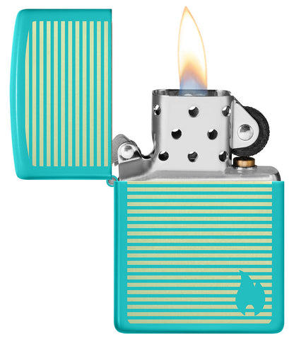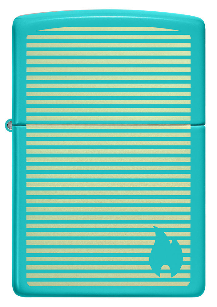 Deze Flat Turquoise aansteker is met een laser gegraveerd om de luxueuze messing strepen te benadrukken die de iconische Zippo vlam omringen in de negatieve ruimte van het ontwerp. Verpakt in een handige geschenkdoos met een #zippodays smartphonehouder!