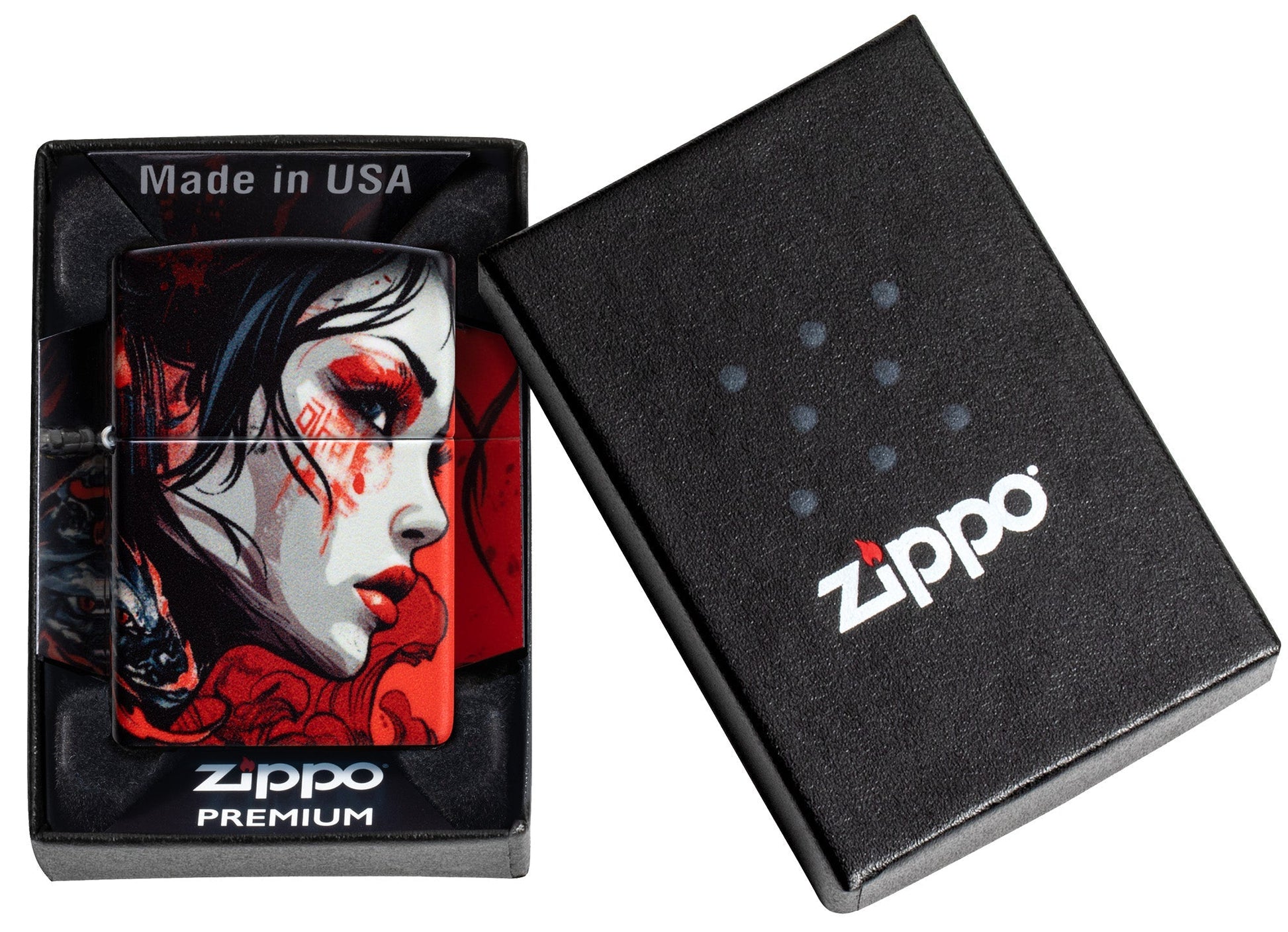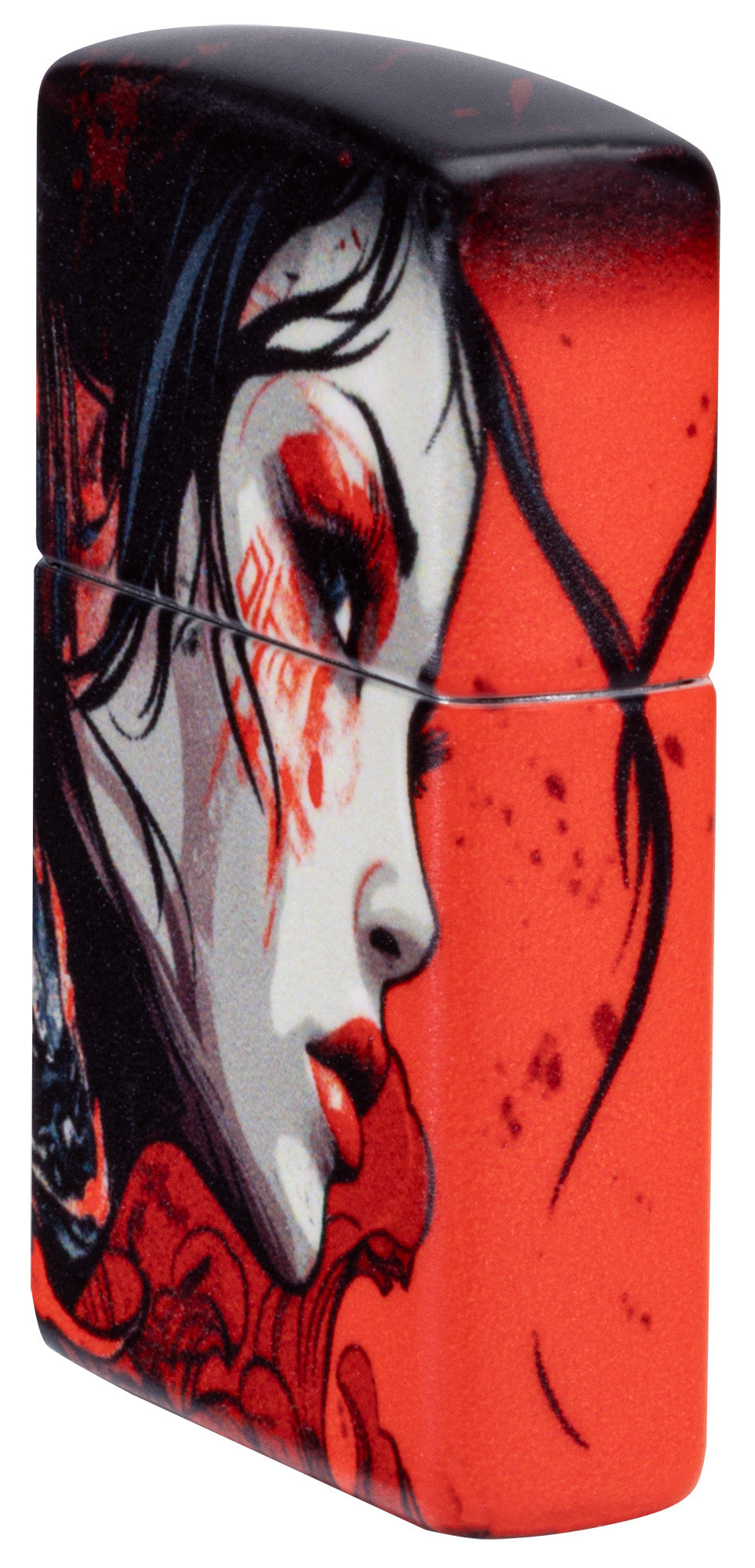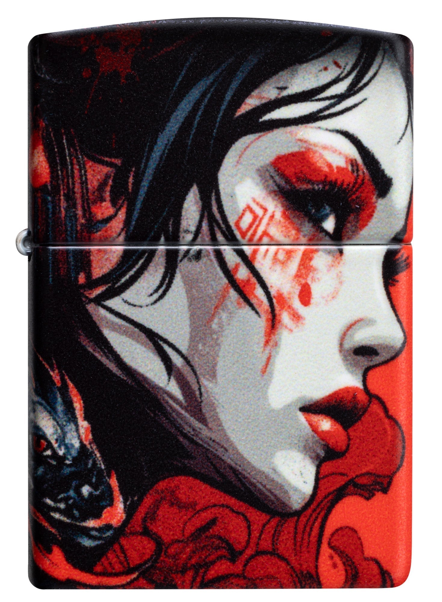 In het feodale Japan trainden dappere krijgers van het vrouwelijke geslacht zowel voor de strijd als voor het verdedigen van hun huizen en hun land. Op deze klassieke 540 Color-aansteker staat een dappere samoerai afgebeeld in een bruisend, abstract ontwerp dat rond de zijkanten van de aansteker doorloopt.