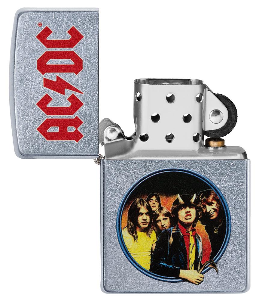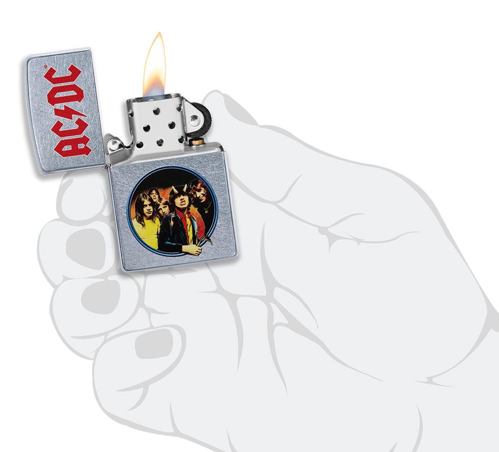 Het logo van de band AC/DC® op een echte Zippo-aansteker met de hoes van het album 'Highway to Hell'.