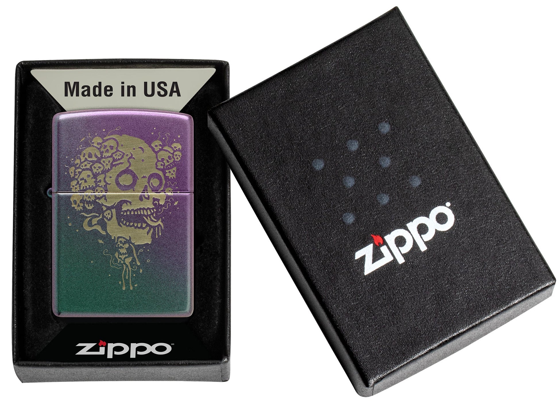 Horrorfans zijn dol op deze klassieke Iridescent-aansteker. Een cluster miniatuurschedels omringt een groter doodshoofd in dit bizarre Laser Engrave-design.