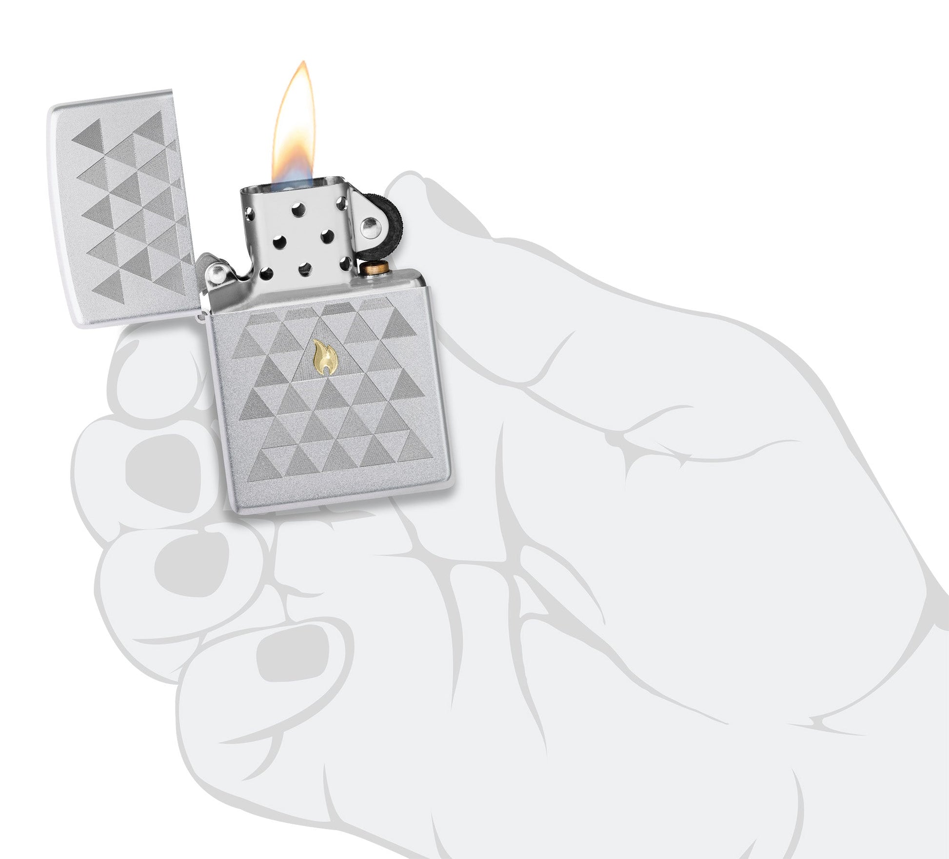 Deze klassieke Satin Chrome-aansteker heeft een fraai driehoeksmotief in een strak Auto Two-Tone-design, met in het midden een Zippo-vlamsymbool in een contrasterende messingtint.