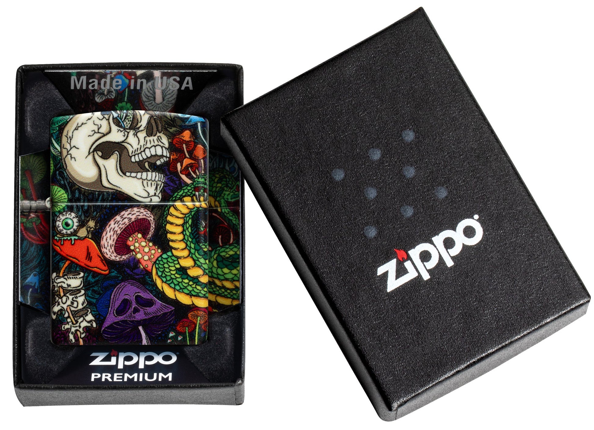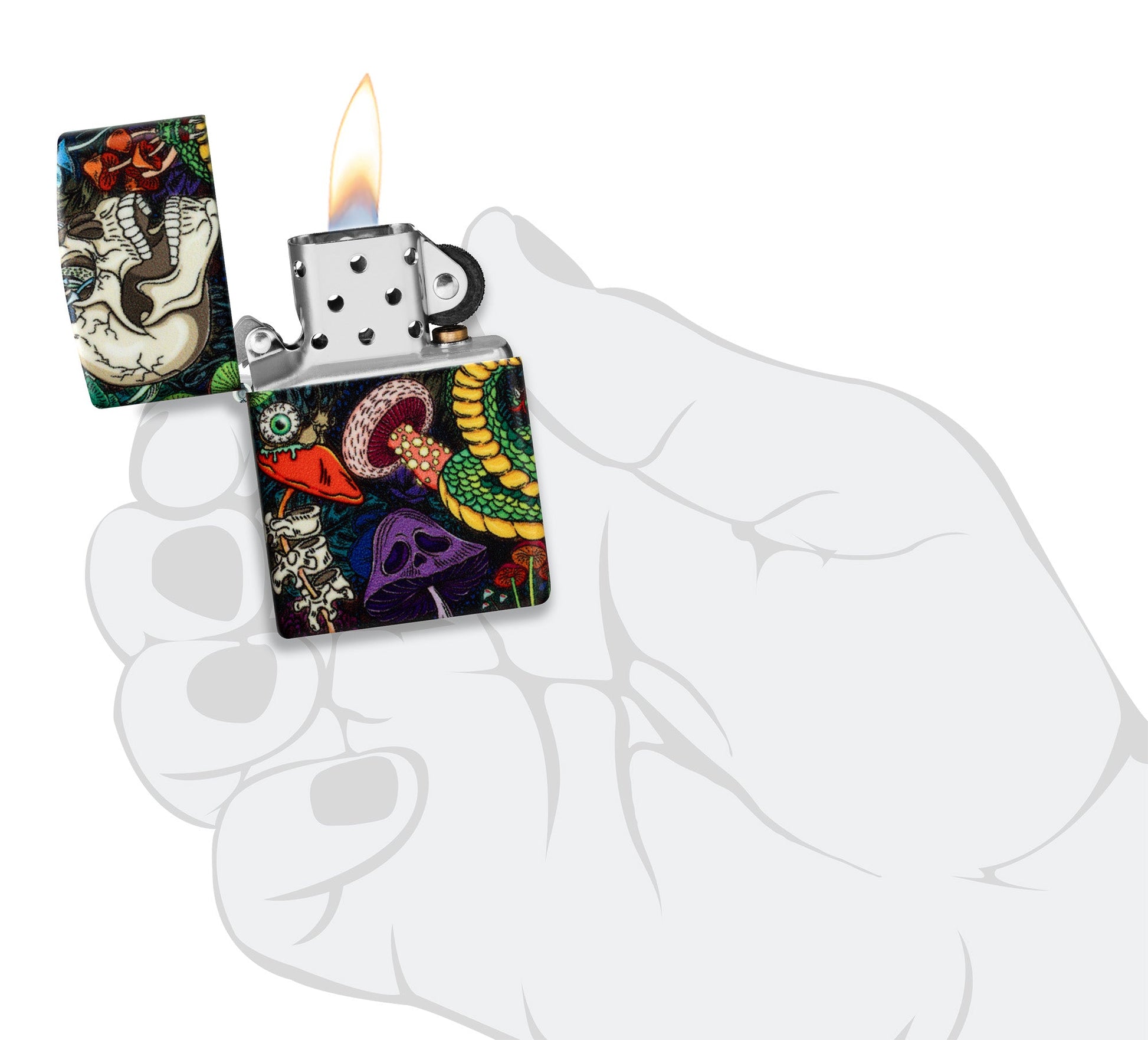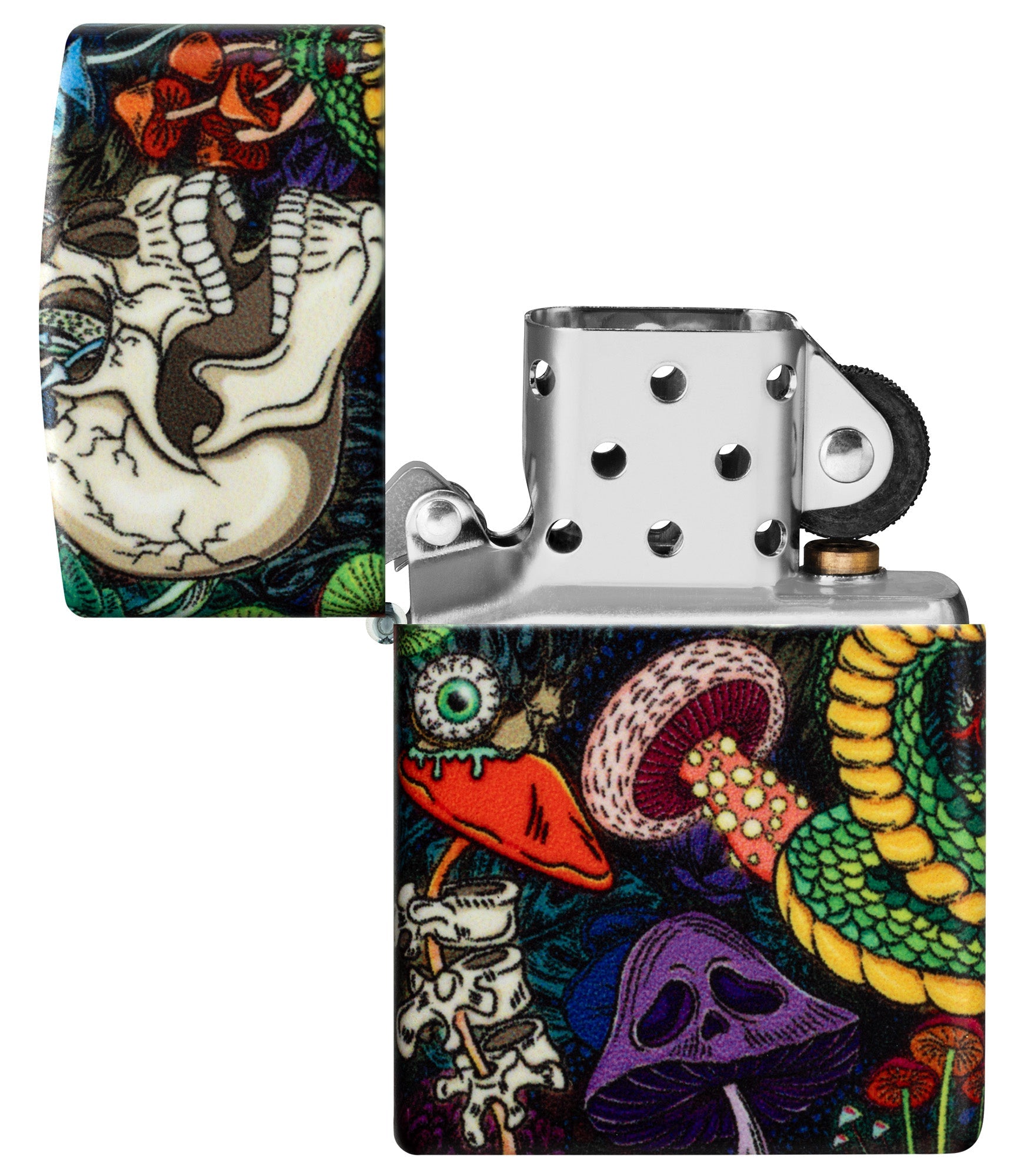 Een skelet wordt omringd door kleurrijke paddenstoelen, starende ogen en kronkelende slangen op deze klassieke 540 Color-aansteker in een betoverend design dat zich naadloos uitstrekt over de hele behuizing.