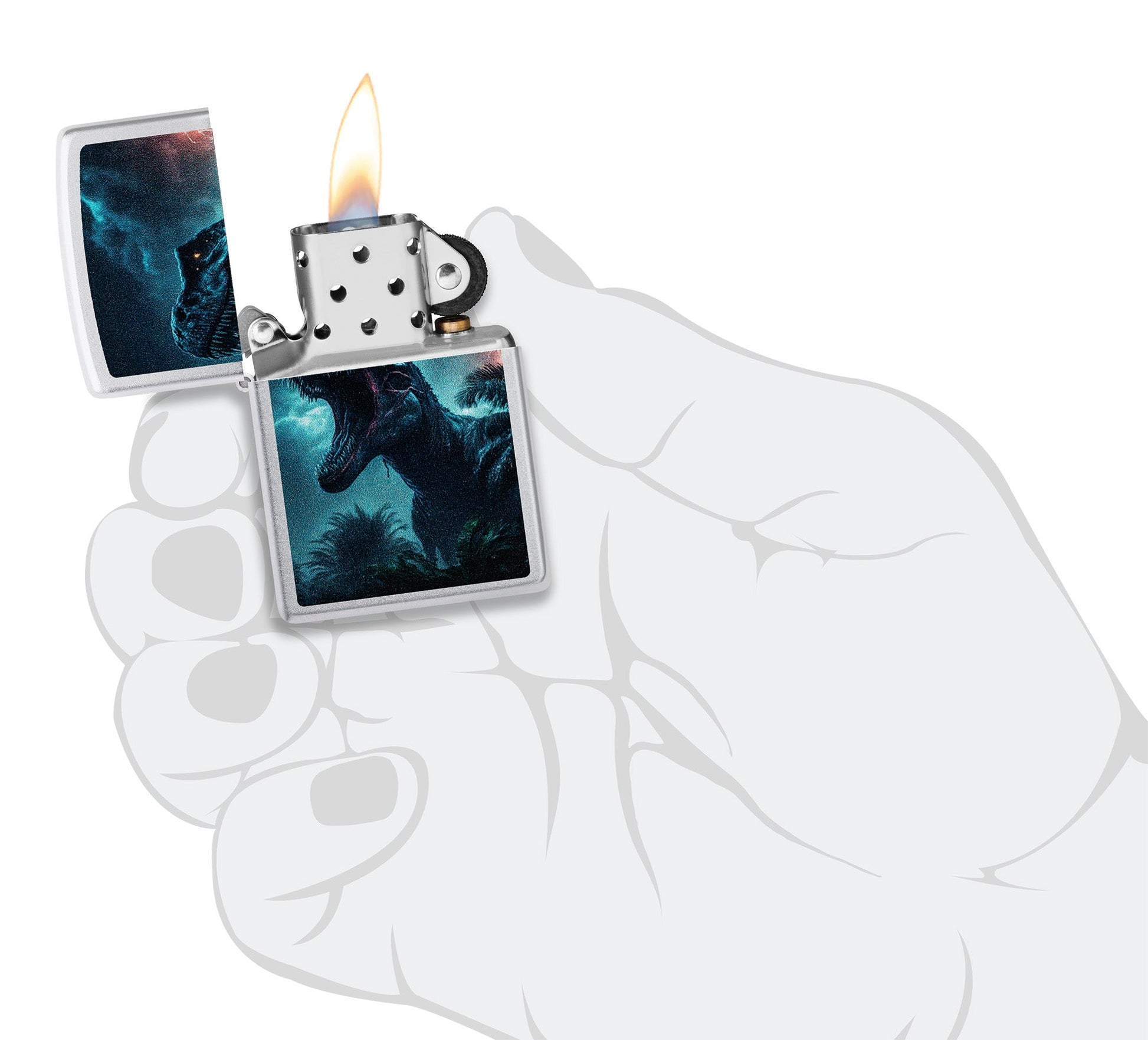 Je waant je in het Jura-tijdperk met deze klassieke Satin Chrome-aansteker. Een tyrannosaurus loopt onder een stormachtige hemel door de jungle in een onheilspellend Color Image-design.