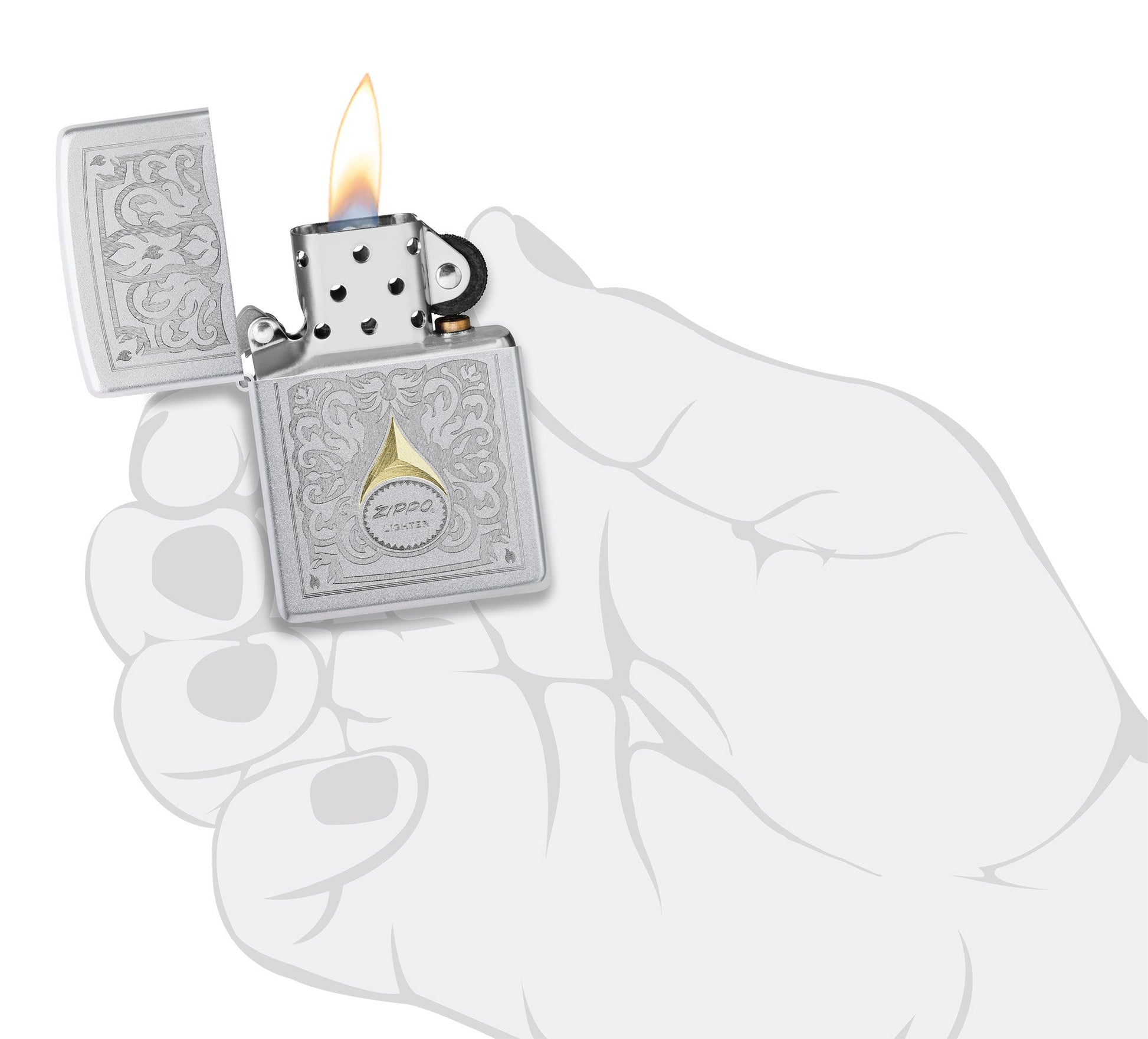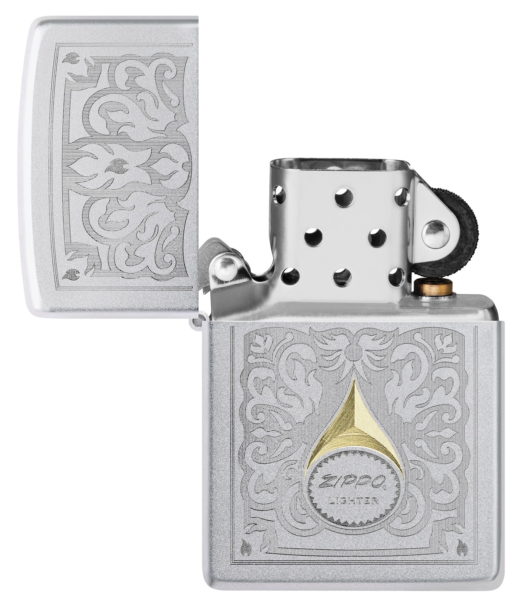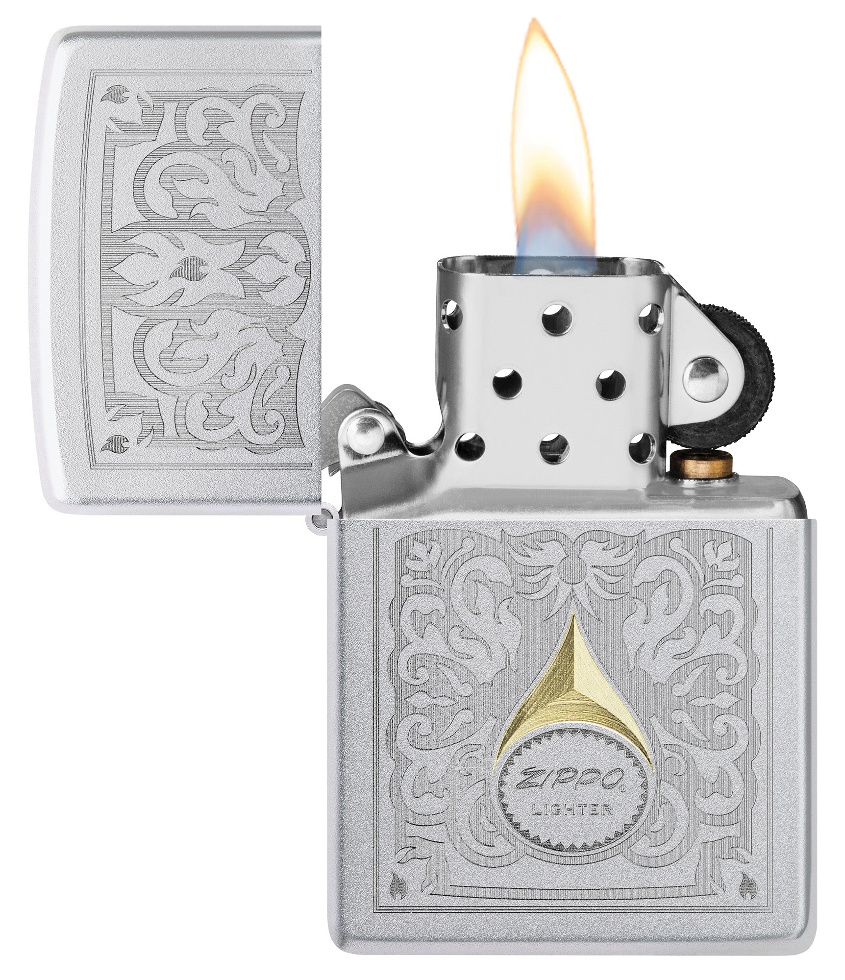 Deze klassieke Satin Chrome-aansteker in een tijdloos Auto Two-Tone-design wordt bekroond met een vintage Zippo-logo tussen fijn filigraan in glanzende messingtinten.