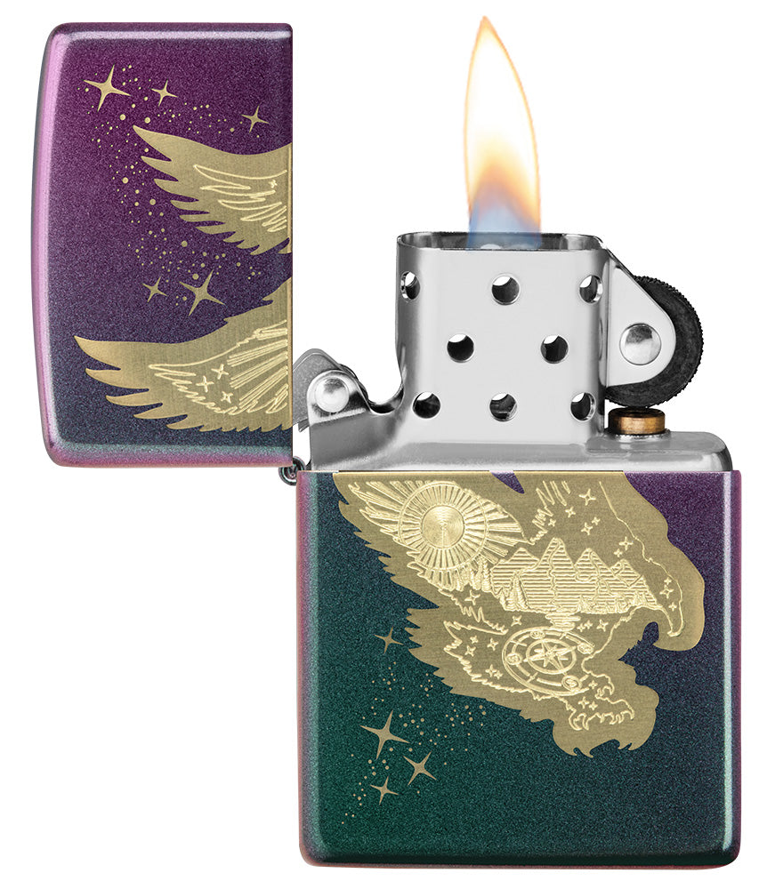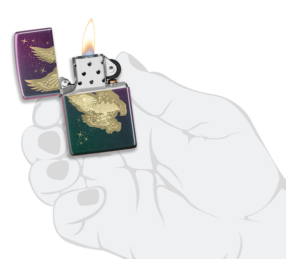 Dompel jezelf onder in de fascinerende wereld van de adelaar. De iriserende glans, het artistieke adelaarsmotief en de hoogwaardige afwerking maken het een begeerd accessoire voor iedereen die van stijl en individualiteit houdt. Laat je betoveren door de fonkelende sterrenachtergrond en het kleurenspel van violet tot donkergroen en geniet van de tijdloze elegantie van deze buitengewone aansteker.
