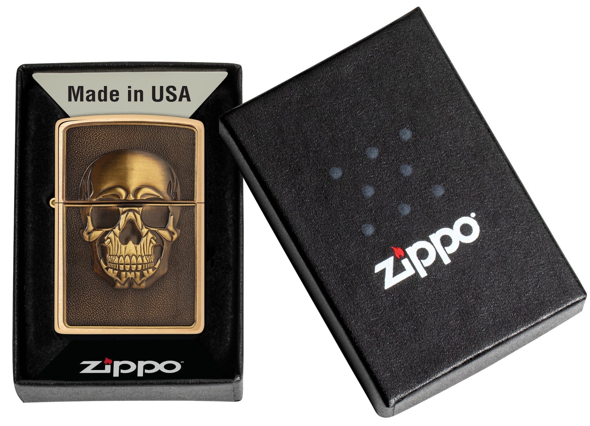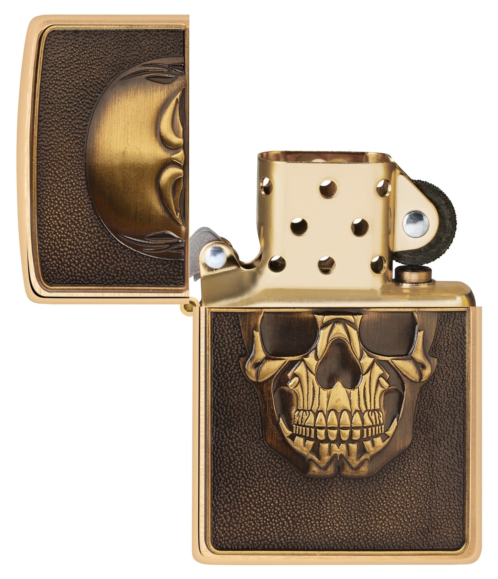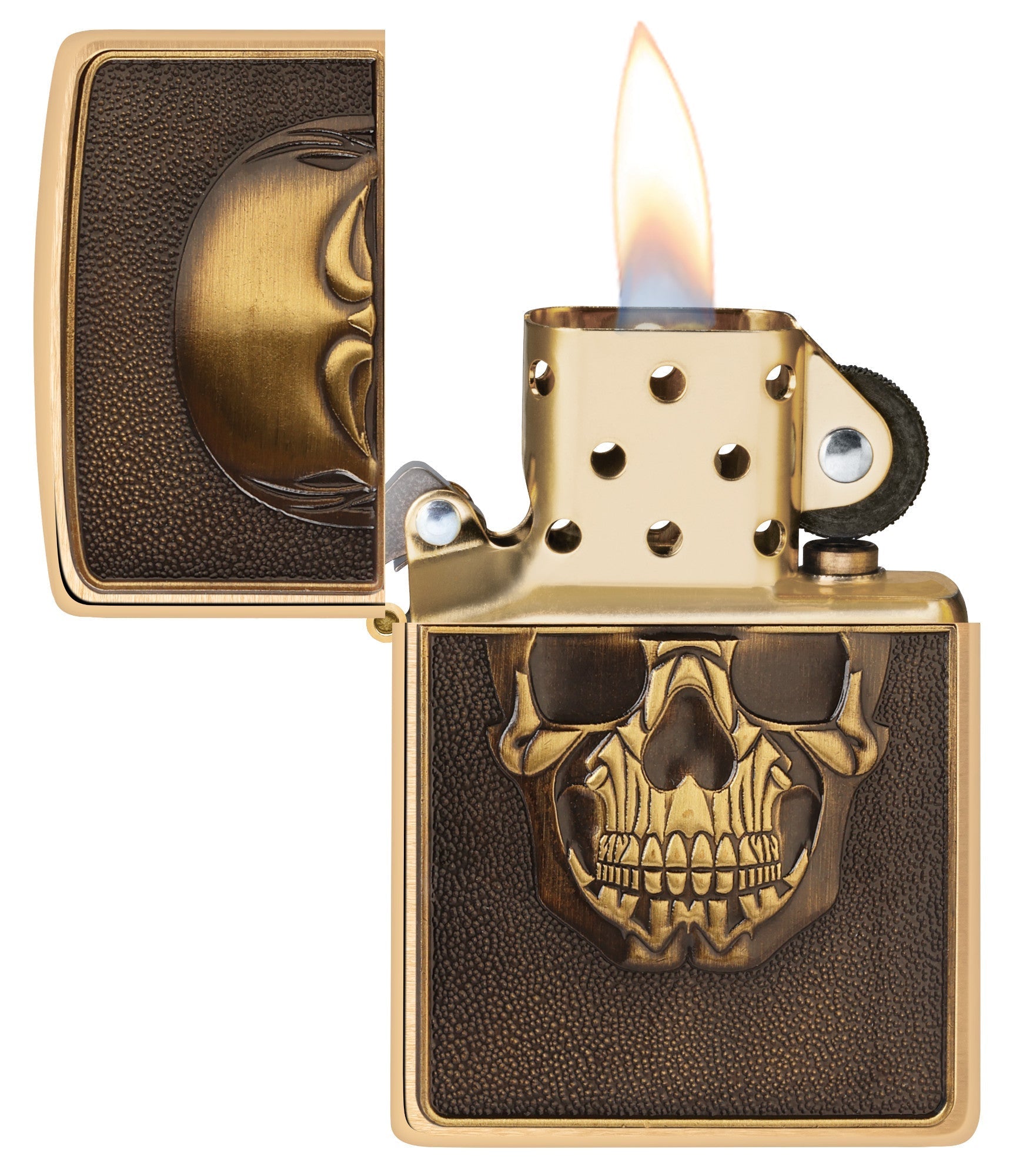 Op het oppervlak van deze klassieke aansteker van geborsteld messing bevindt zich een getextureerd metalen embleem met een gedetailleerd afgebeelde, grijnzende schedel.
