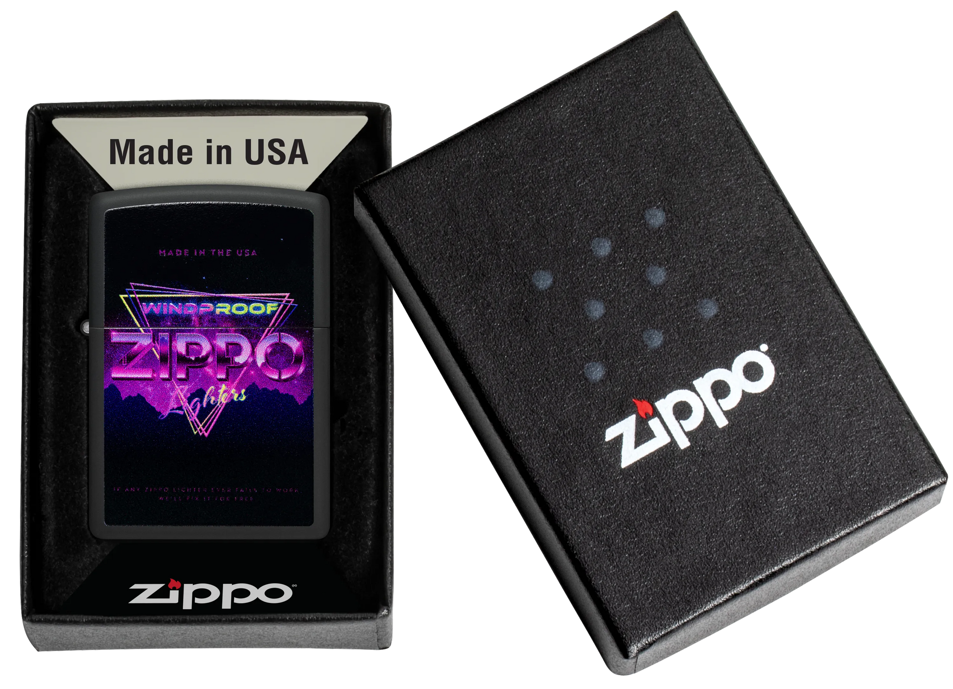 Toon je liefde voor je favoriete merk met deze klassieke Black Matte aansteker. Het retro-geïnspireerde Color Image design bootst felle neonlichten na en herinnert ons aan de iconische windbestendige aansteker van Zippo.