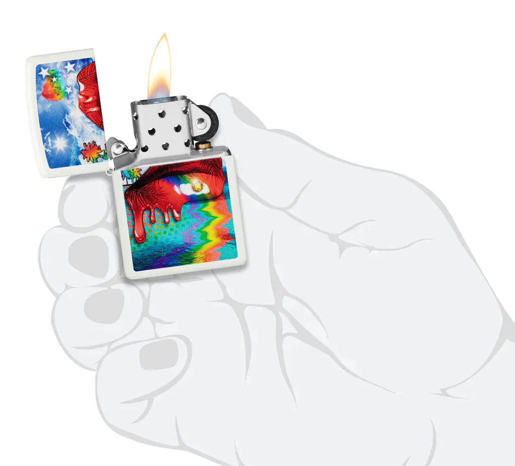 Een paar glinsterende lippen smelten samen onder een glinsterende hemel op deze matwitte aansteker met het wonderlijk surrealistische Colour Image-motief. De aansteker is verpakt in een geschenkdoos. Voor optimale prestaties vul je de aansteker met Zippo-benzine.