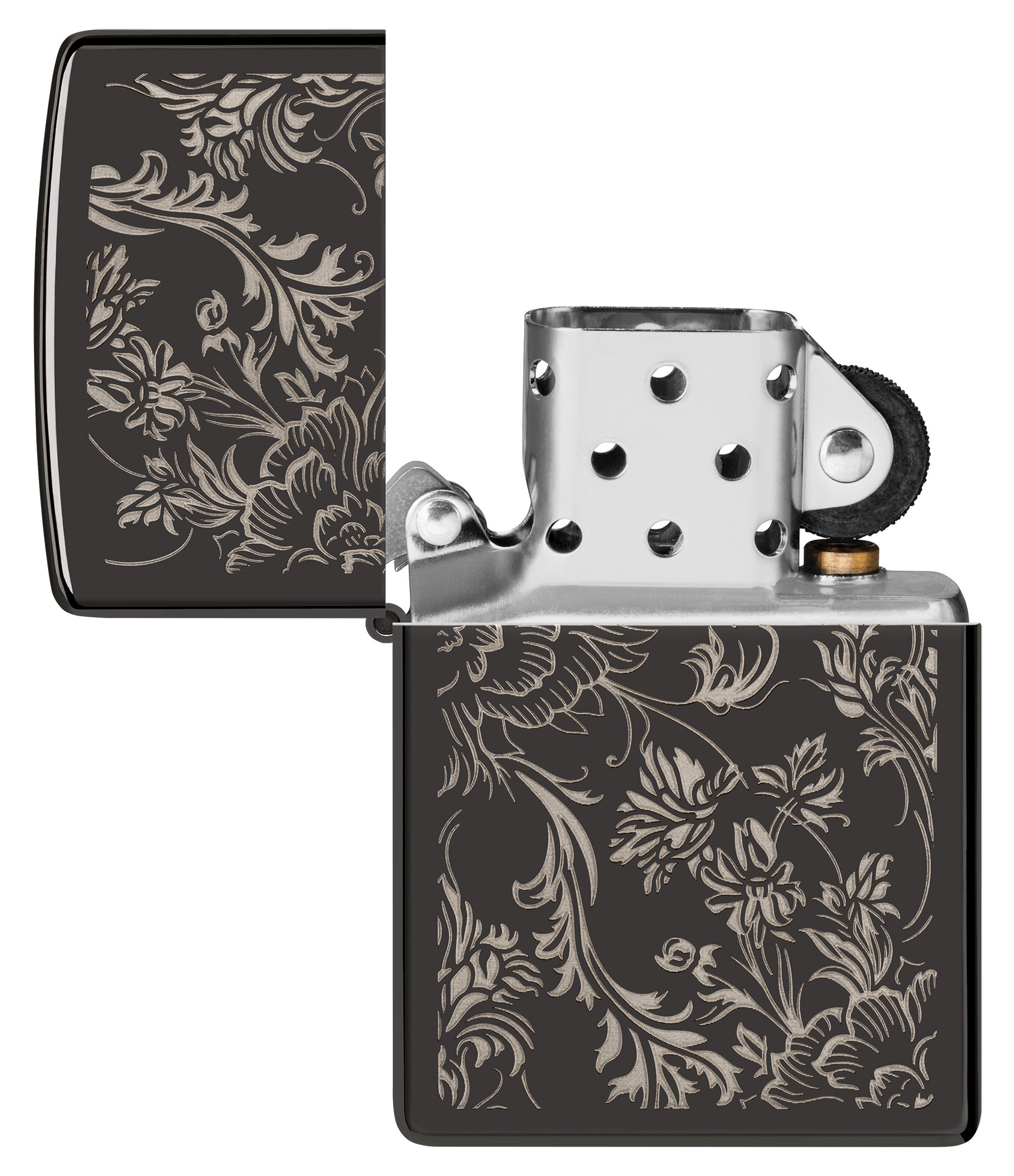 Voeg met deze aansteker in hoogglans zwart een tijdloze touch aan je collectie toe. Elegante bloemen wervelen over het oppervlak van de aansteker in een ontwerp met gedetailleerde lasergravure.