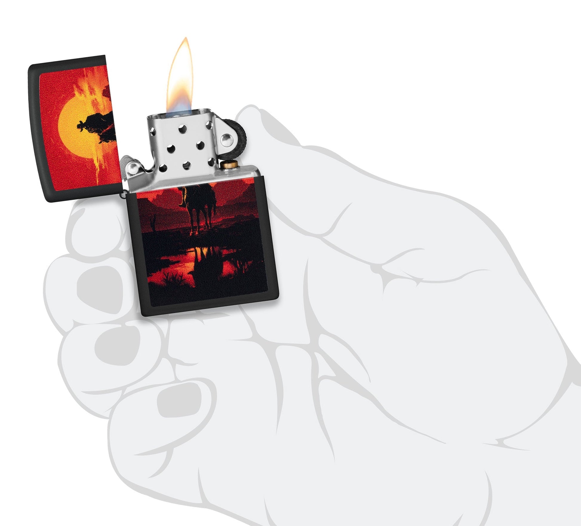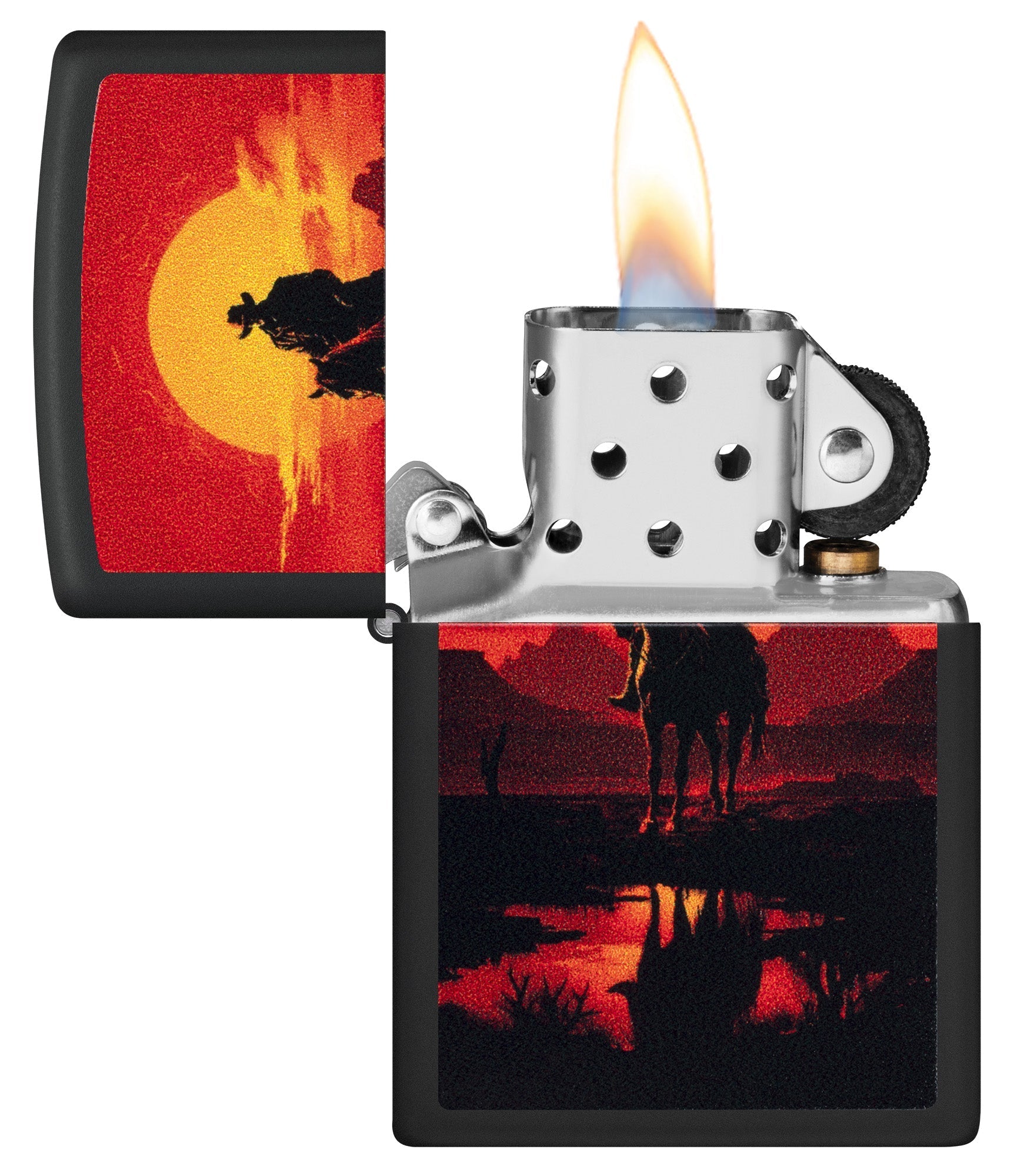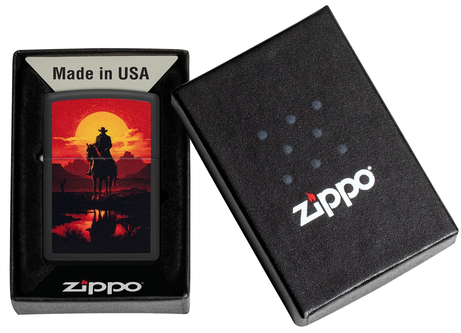Met op de achtergrond een schitterende zonsondergang poseert in een kleurrijk ontwerp van deze klassieke, mat-zwarte aansteker een veedrijver te paard.