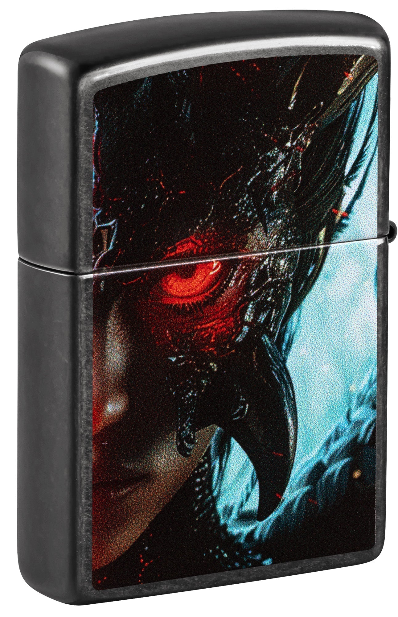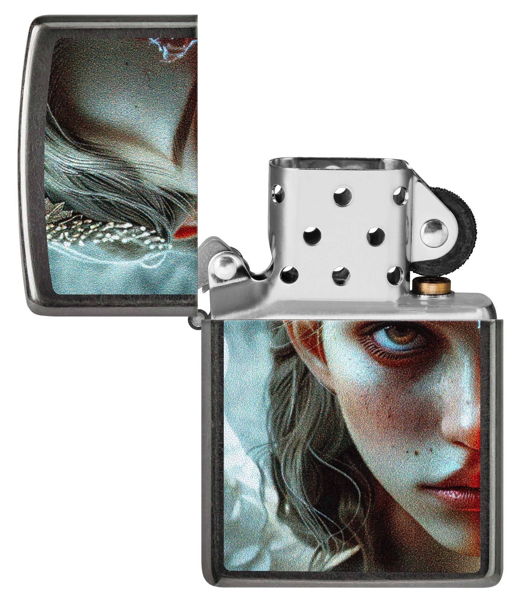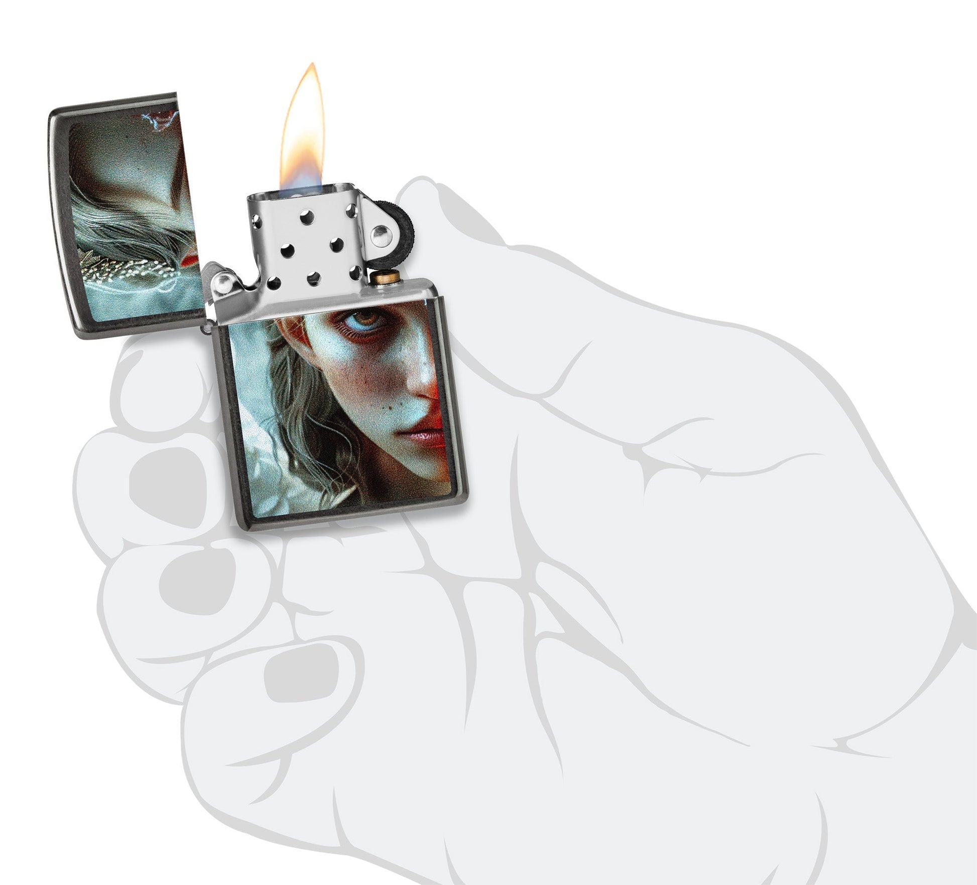 De dualiteit van de menselijke natuur wordt perfect weergegeven op deze klassiek grijze aansteker. Waar op de voorkant het gedeelte van de engel staat afgebeeld, domineert de duivel op de achterkant in een ontwerp met bijpassende kleuren.