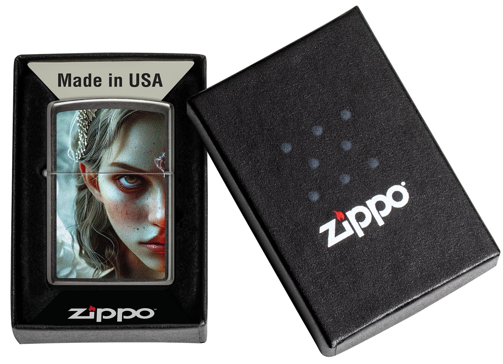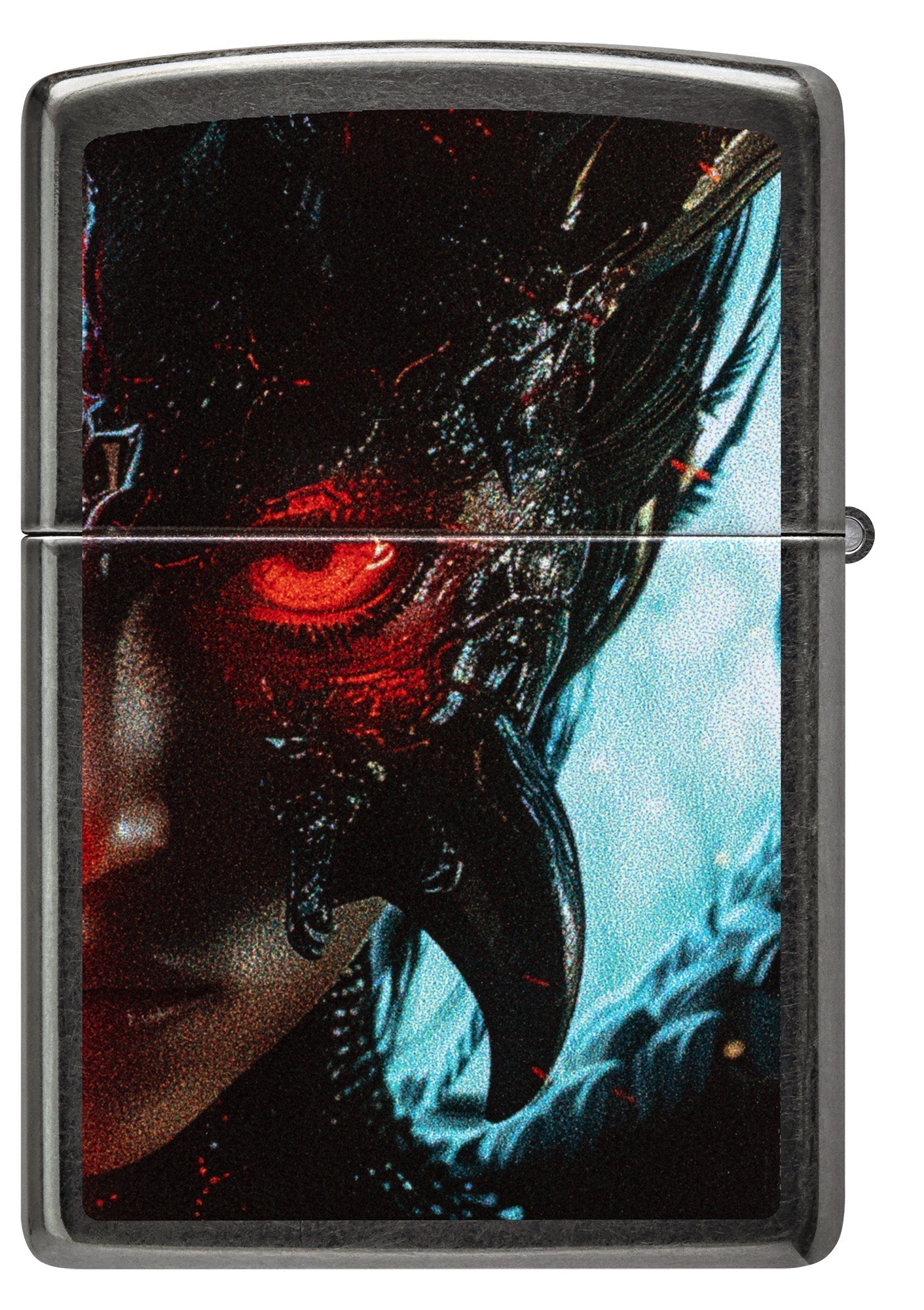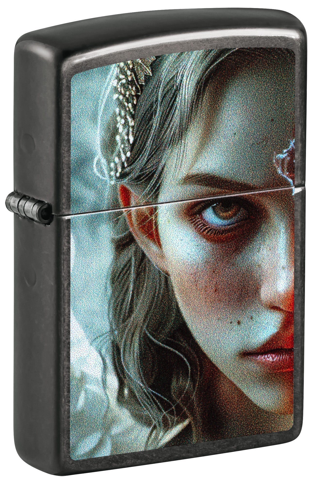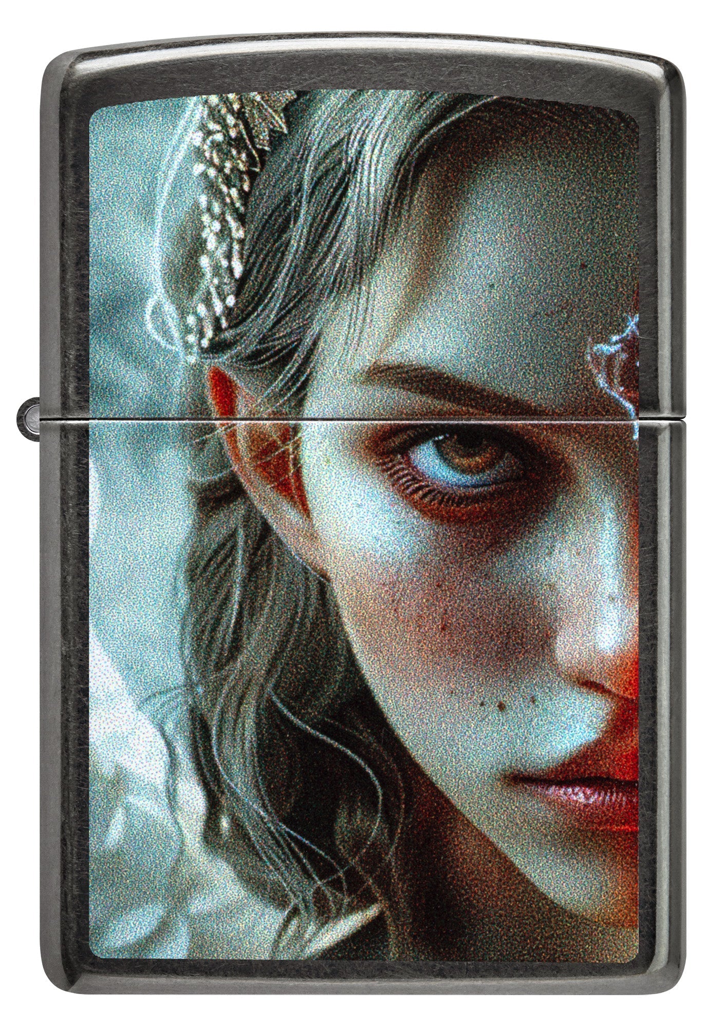 De dualiteit van de menselijke natuur wordt perfect weergegeven op deze klassiek grijze aansteker. Waar op de voorkant het gedeelte van de engel staat afgebeeld, domineert de duivel op de achterkant in een ontwerp met bijpassende kleuren.