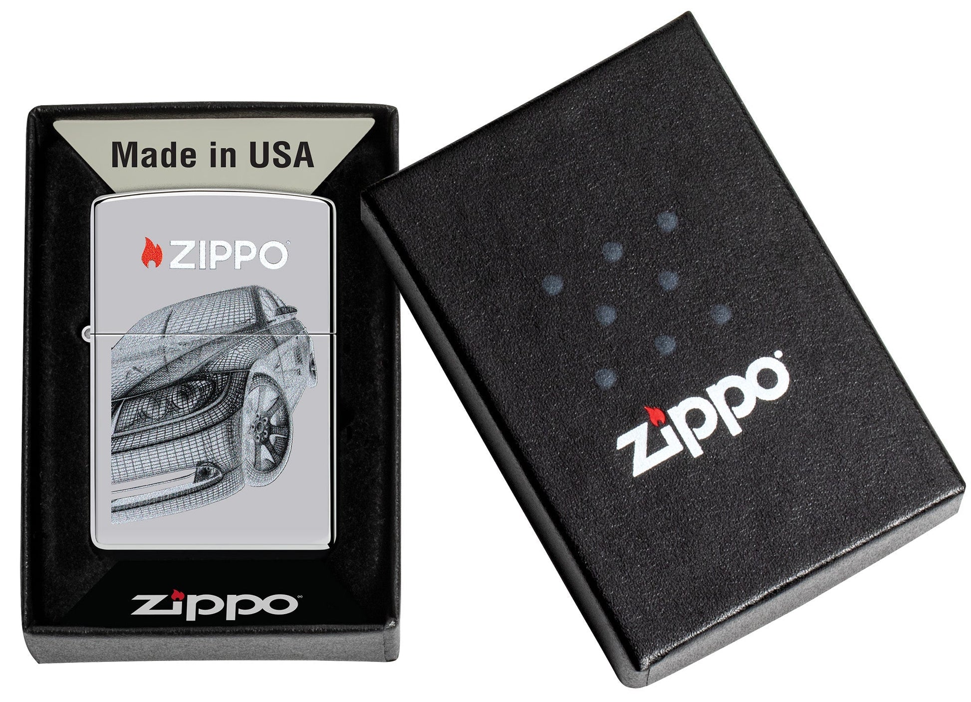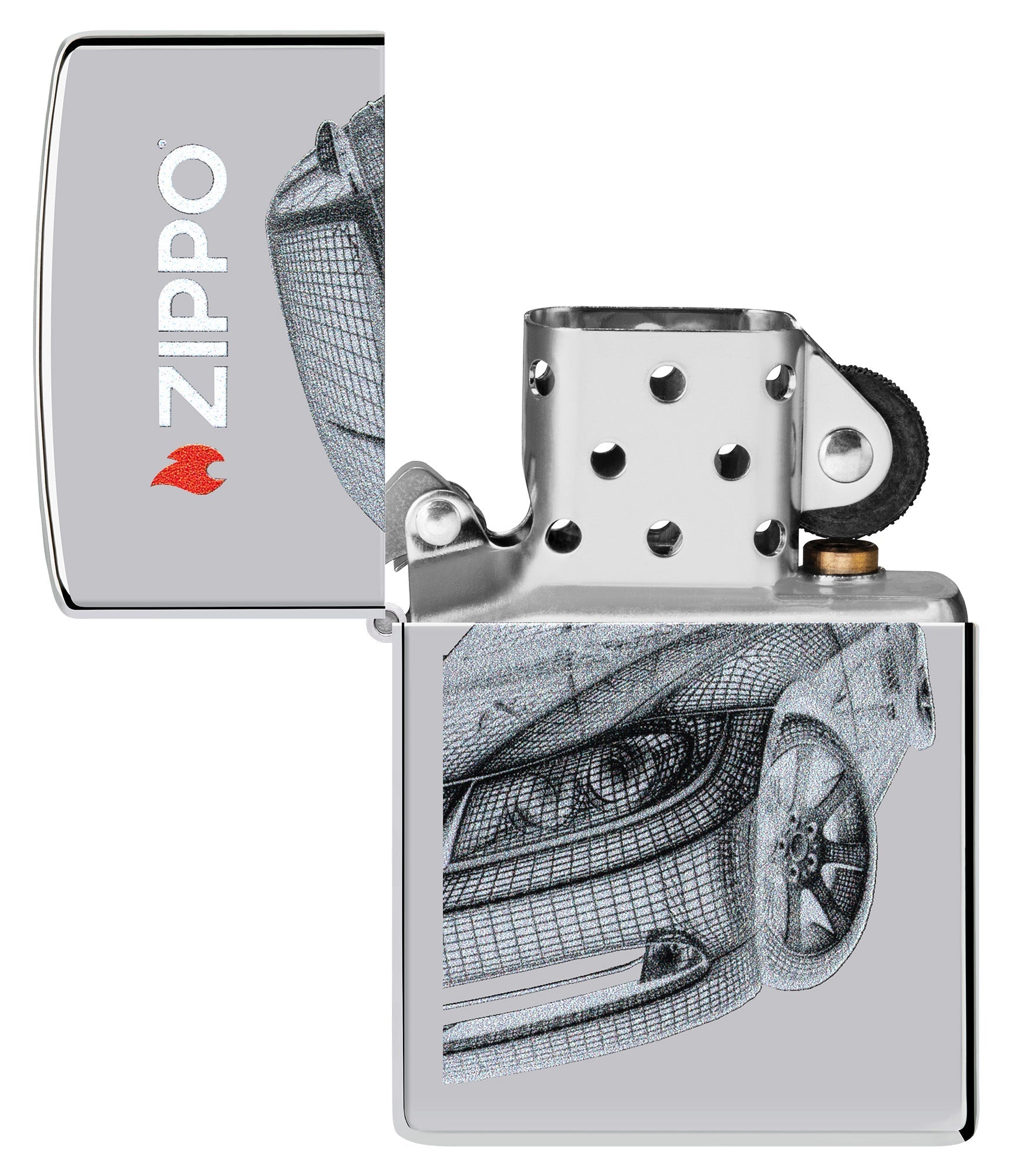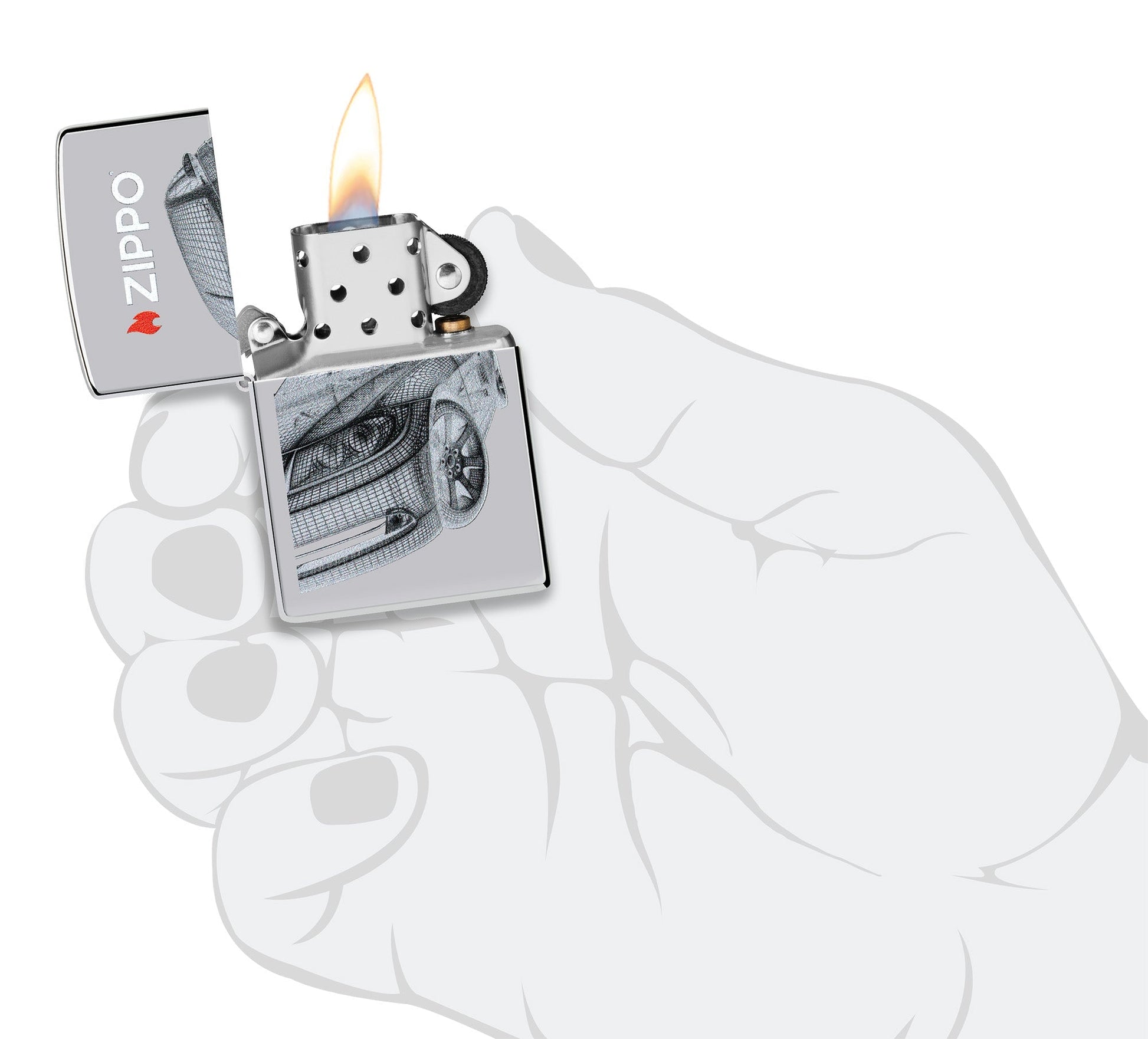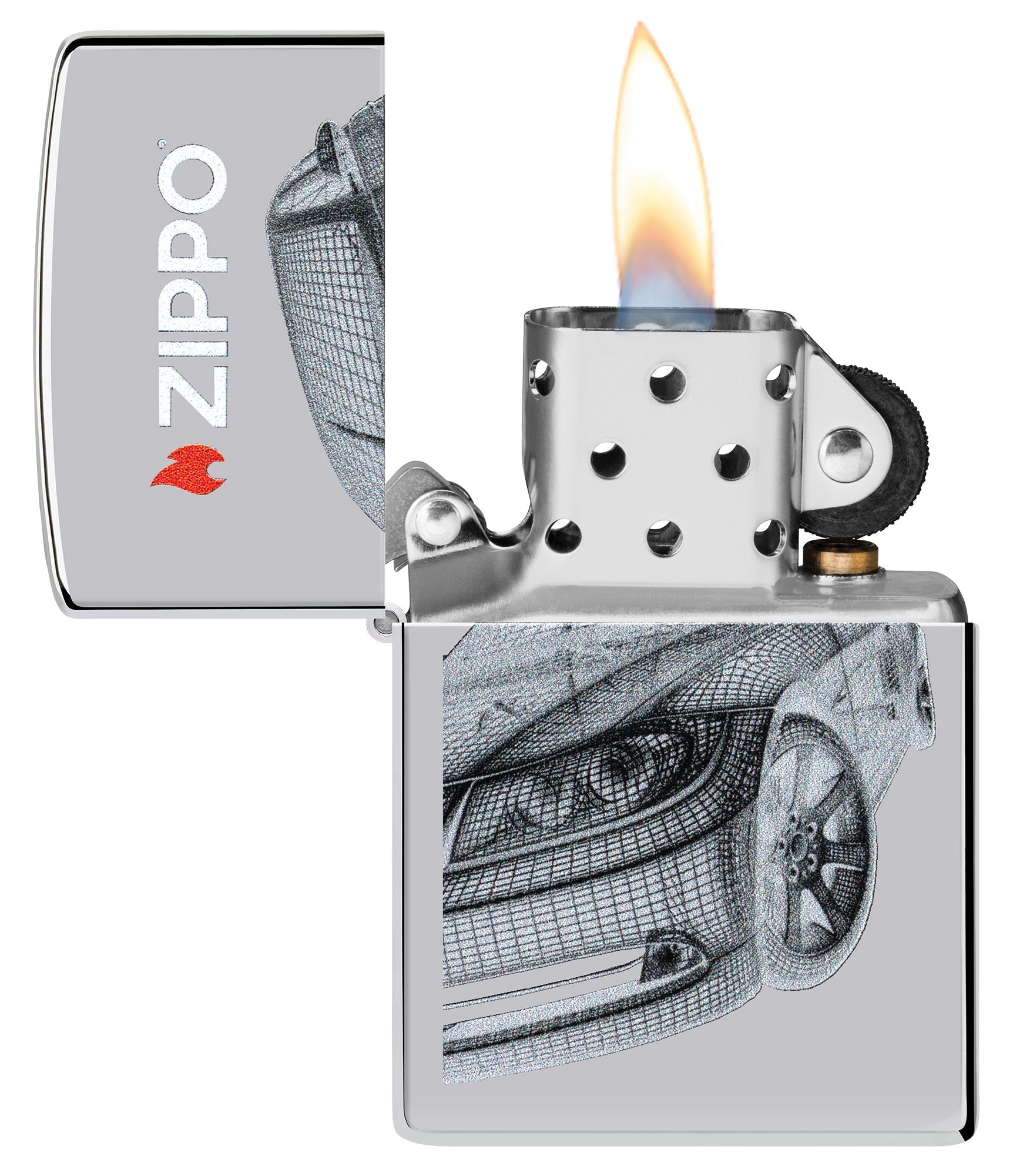 In een moderne, gedigitaliseerde stijl racet een sportwagen naar de voorgrond van deze klassieke aansteker van hoogglanzend chroom in een futuristisch ontwerp.