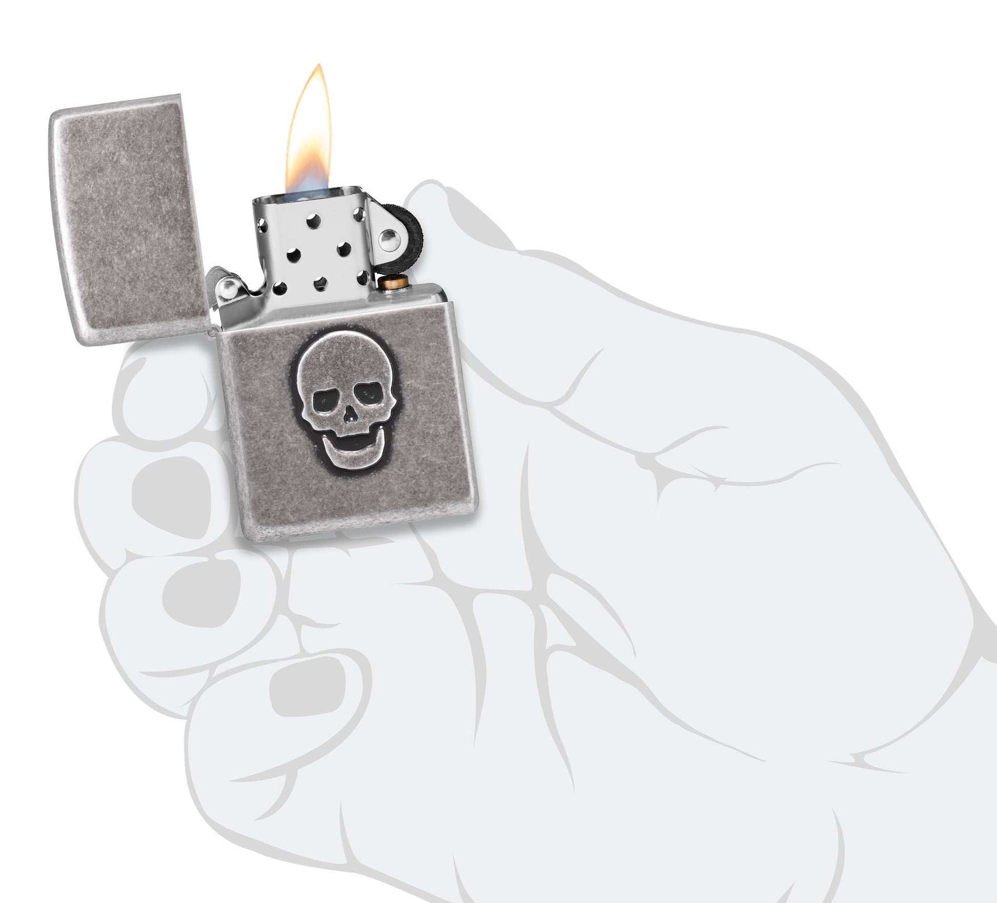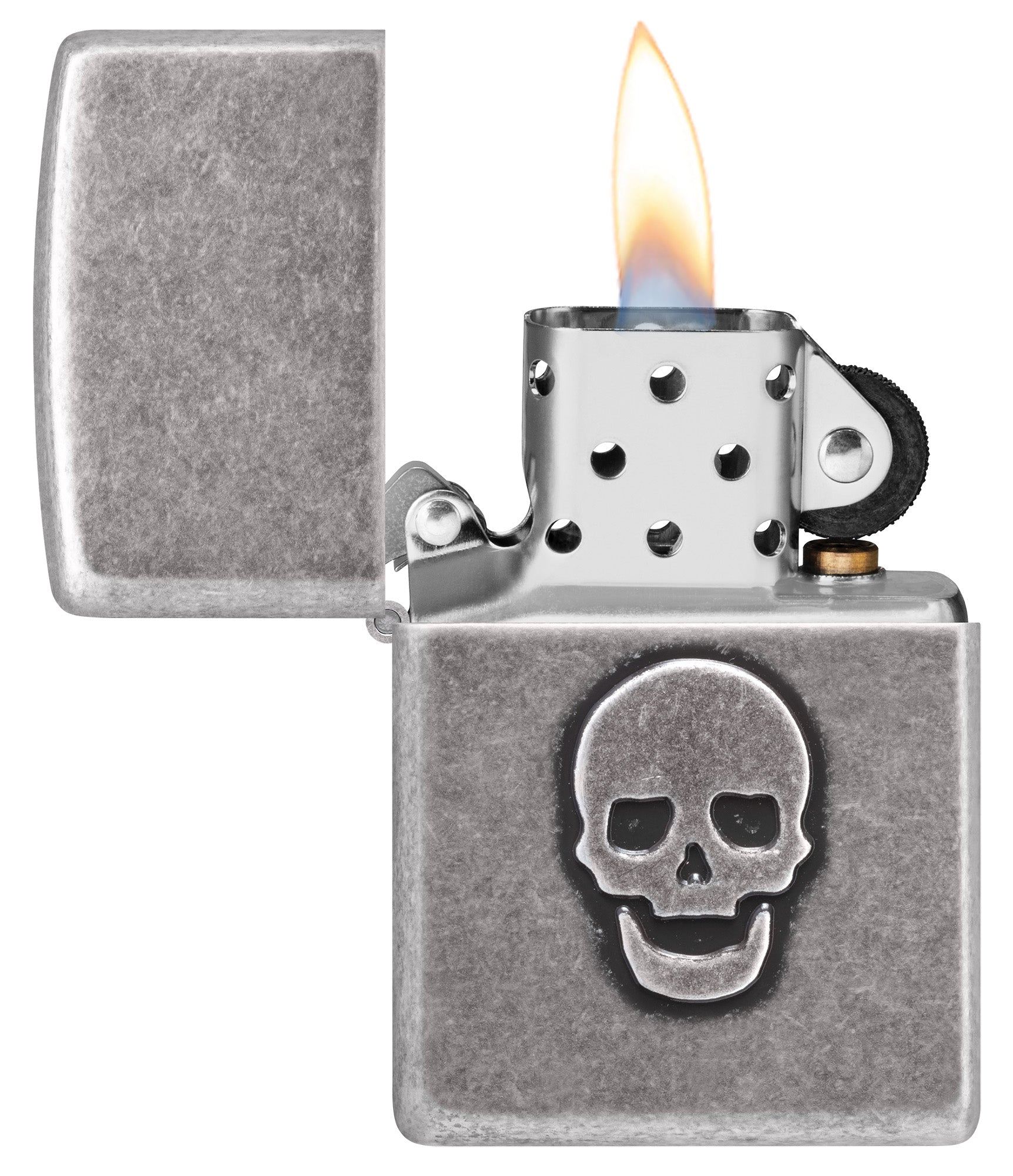 In het oppervlak van deze klassieke aansteker van antiek zilver is een eenvoudige schedel gestempeld, wat subtiele diepte en textuur aan de elegante afwerking toevoegt.