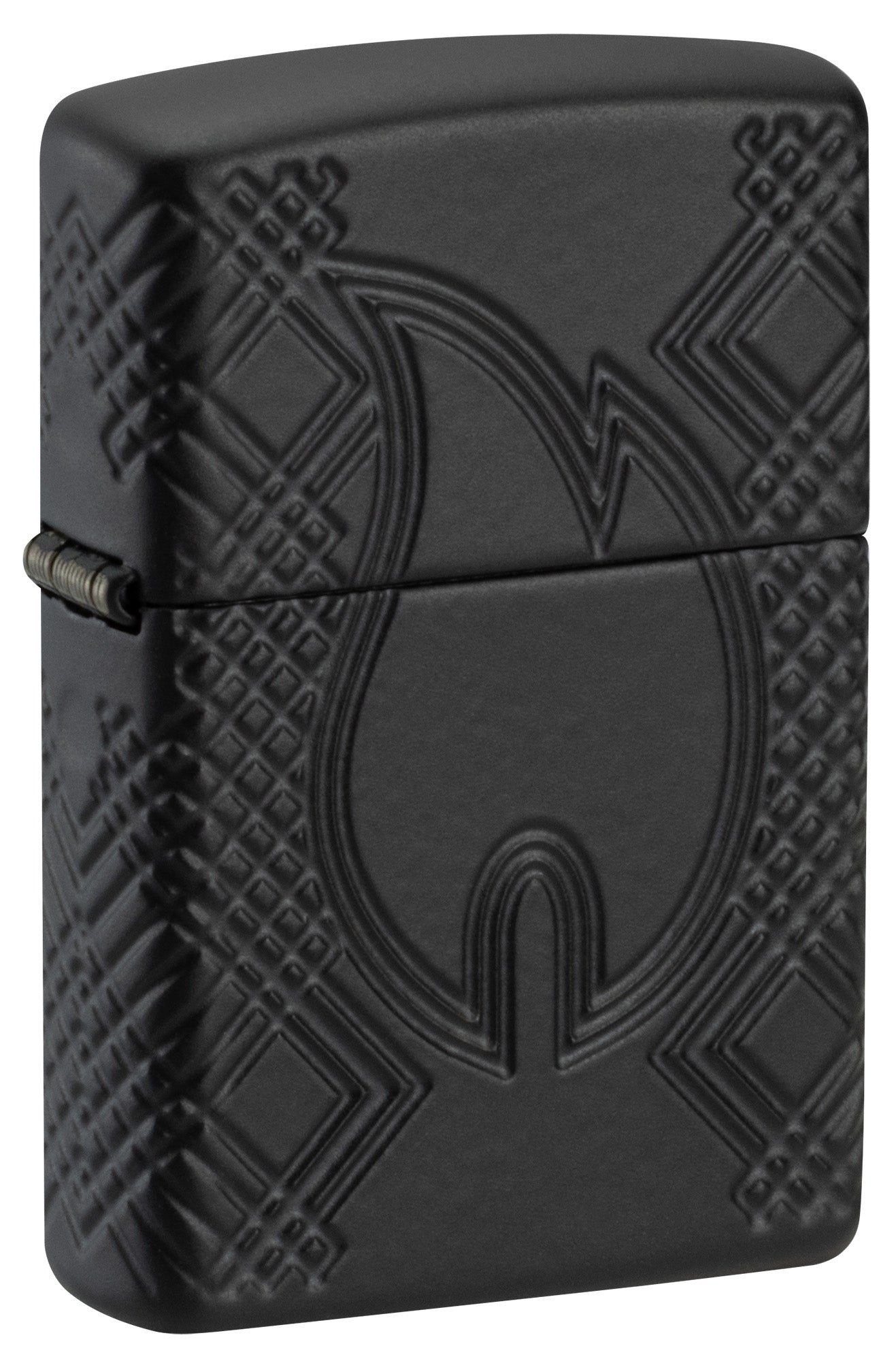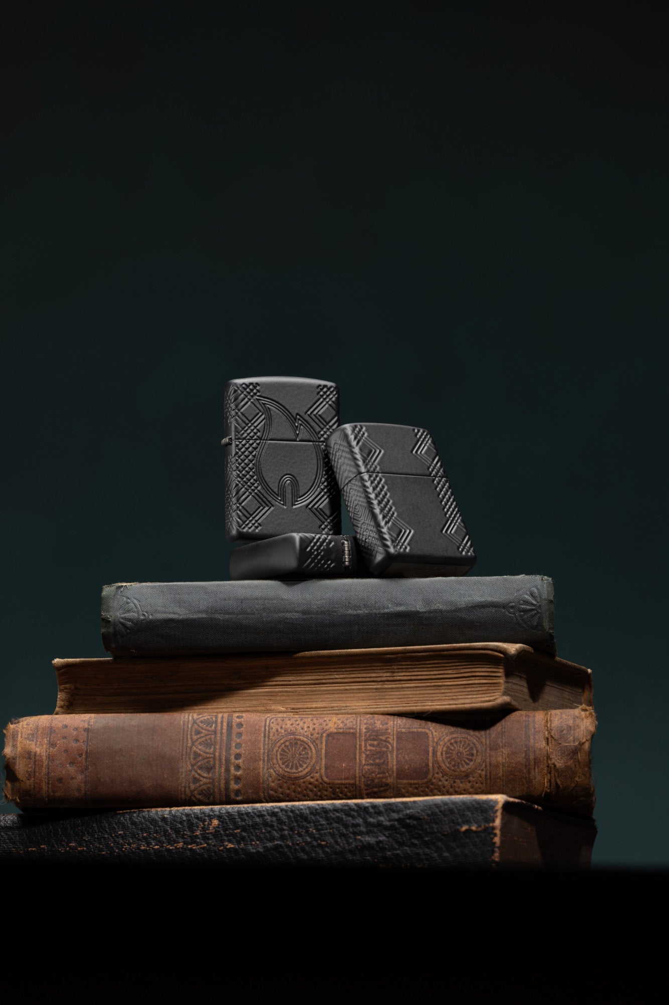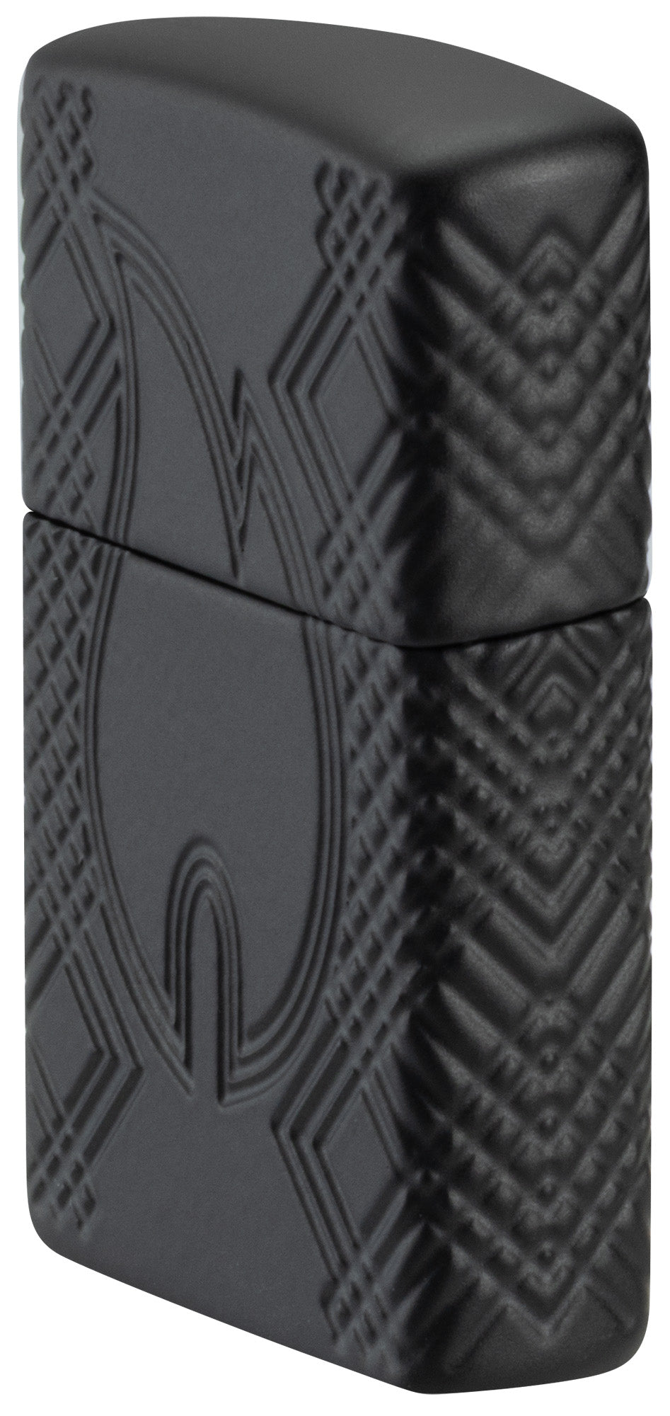 Het Zippo-vlam-pictogram is omgeven door een klinknagelmotief met rijke textuur op deze mat-zwarte Armor®-aansteker in een luxueus MultiCut-ontwerp dat zich rondom de aansteker uitstrekt.