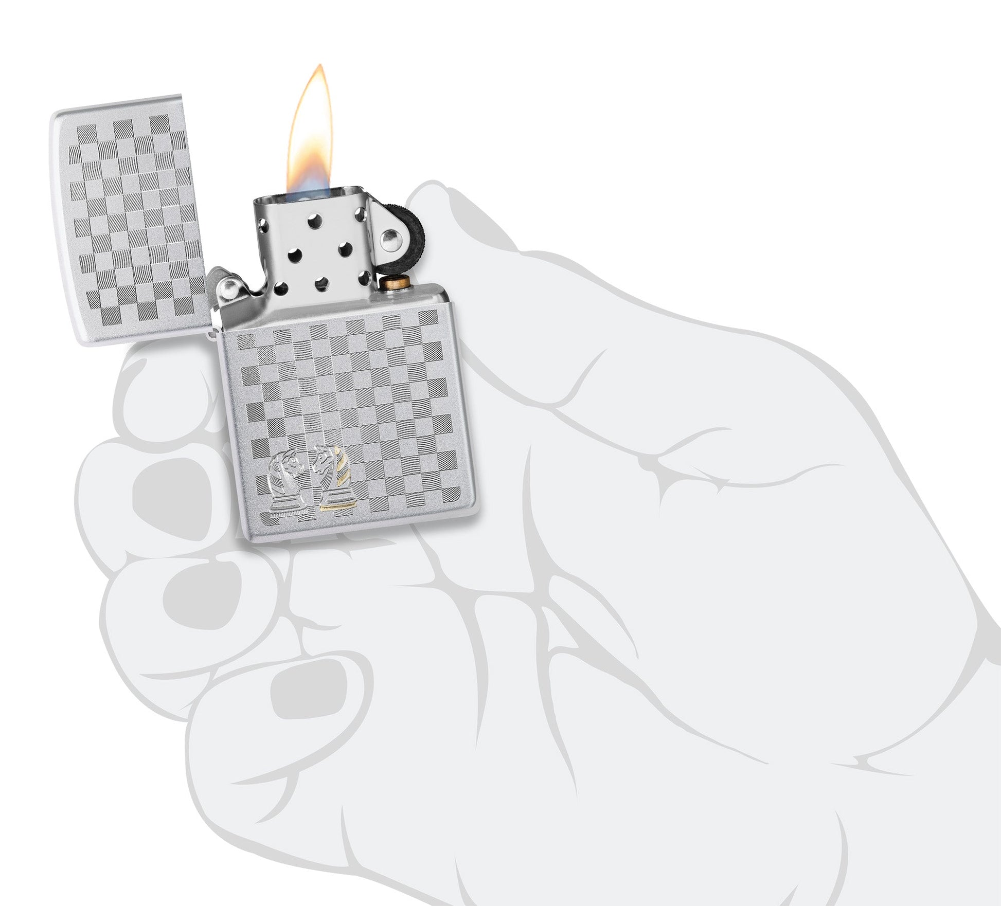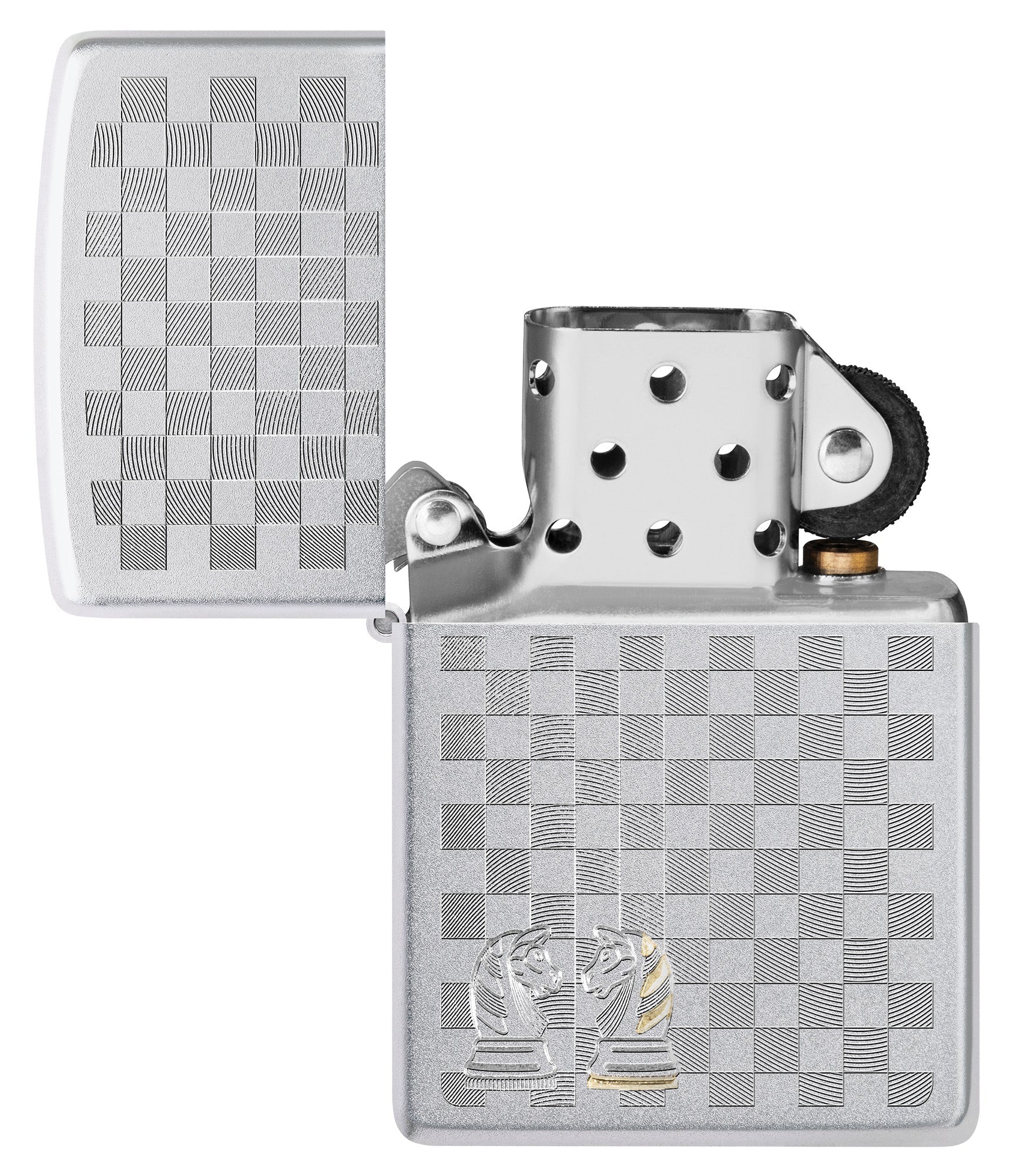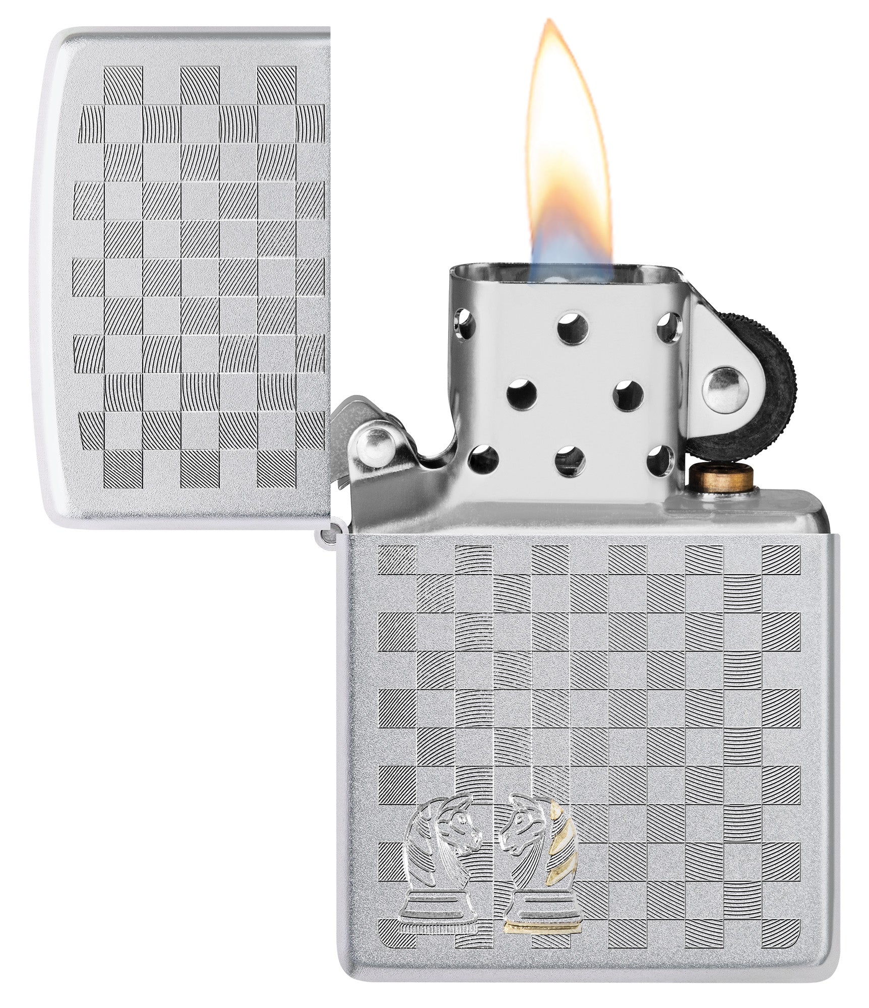 Of je nu een fan van schaken bent of gefascineerd door tactische strategie, je zult dol zijn op deze klassieke aansteker van gesatineerd chroom. Op de voorkant is een klassiek schaakbord gegraveerd, met daaronder duellerende ridders in een gedetailleerd Auto Two-Tone-ontwerp.