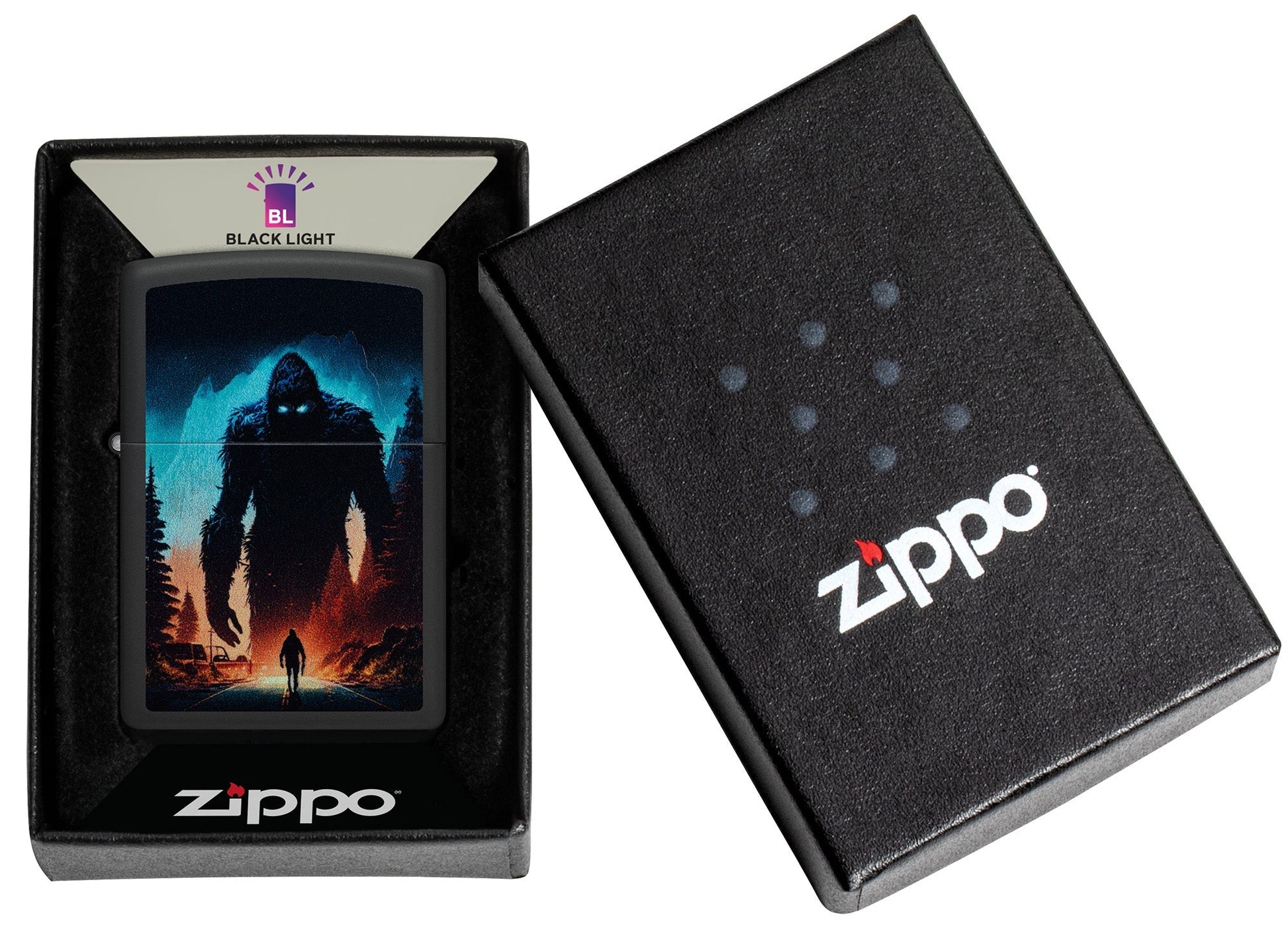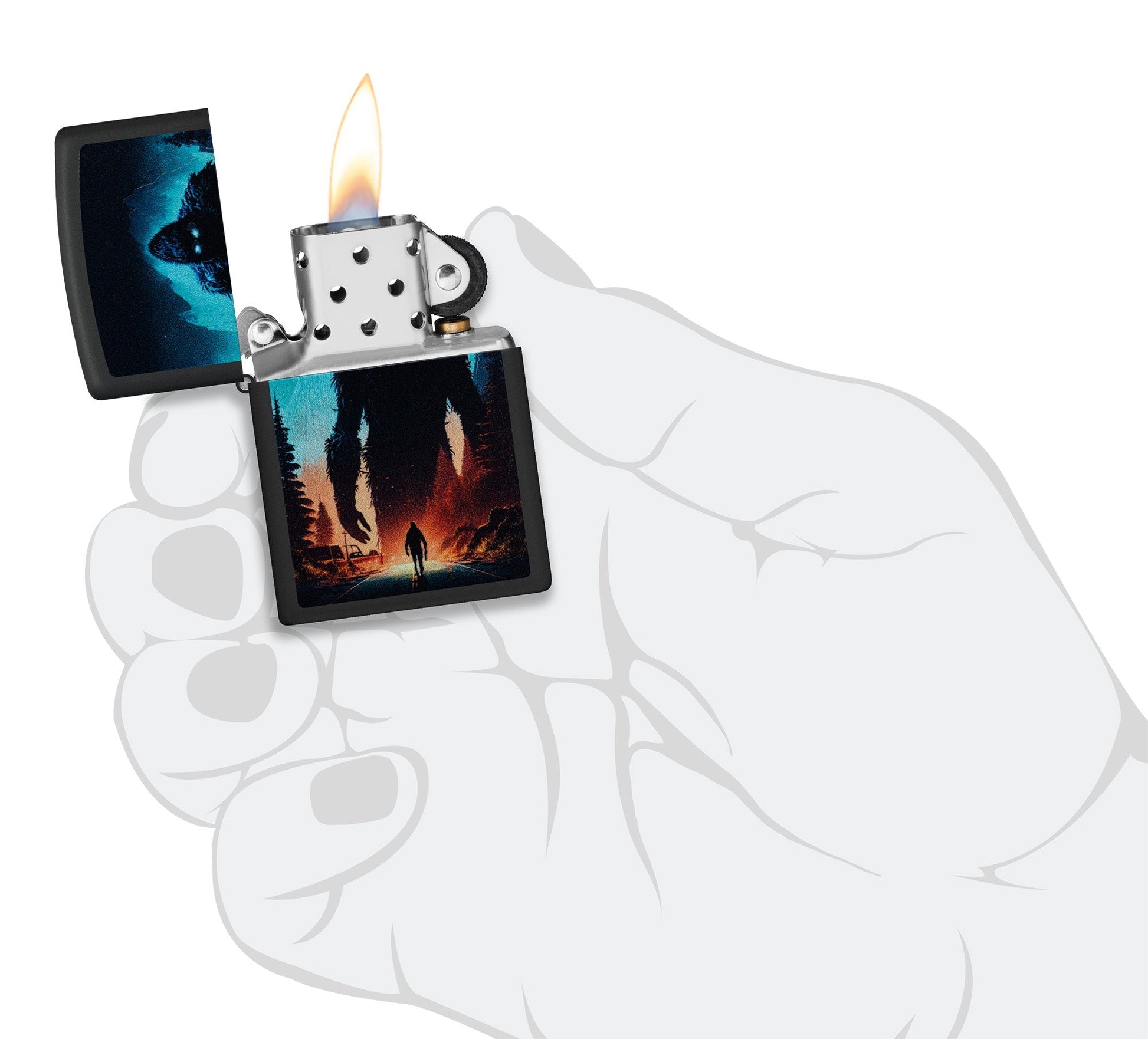 Een enorme bigfoot torent hoog uit over een door de maan verlichte weg op deze klassieke, mat-zwarte aansteker. Het spookachtige ontwerp licht op onder ultraviolet licht dankzij ons speciale Black Light-proces.
