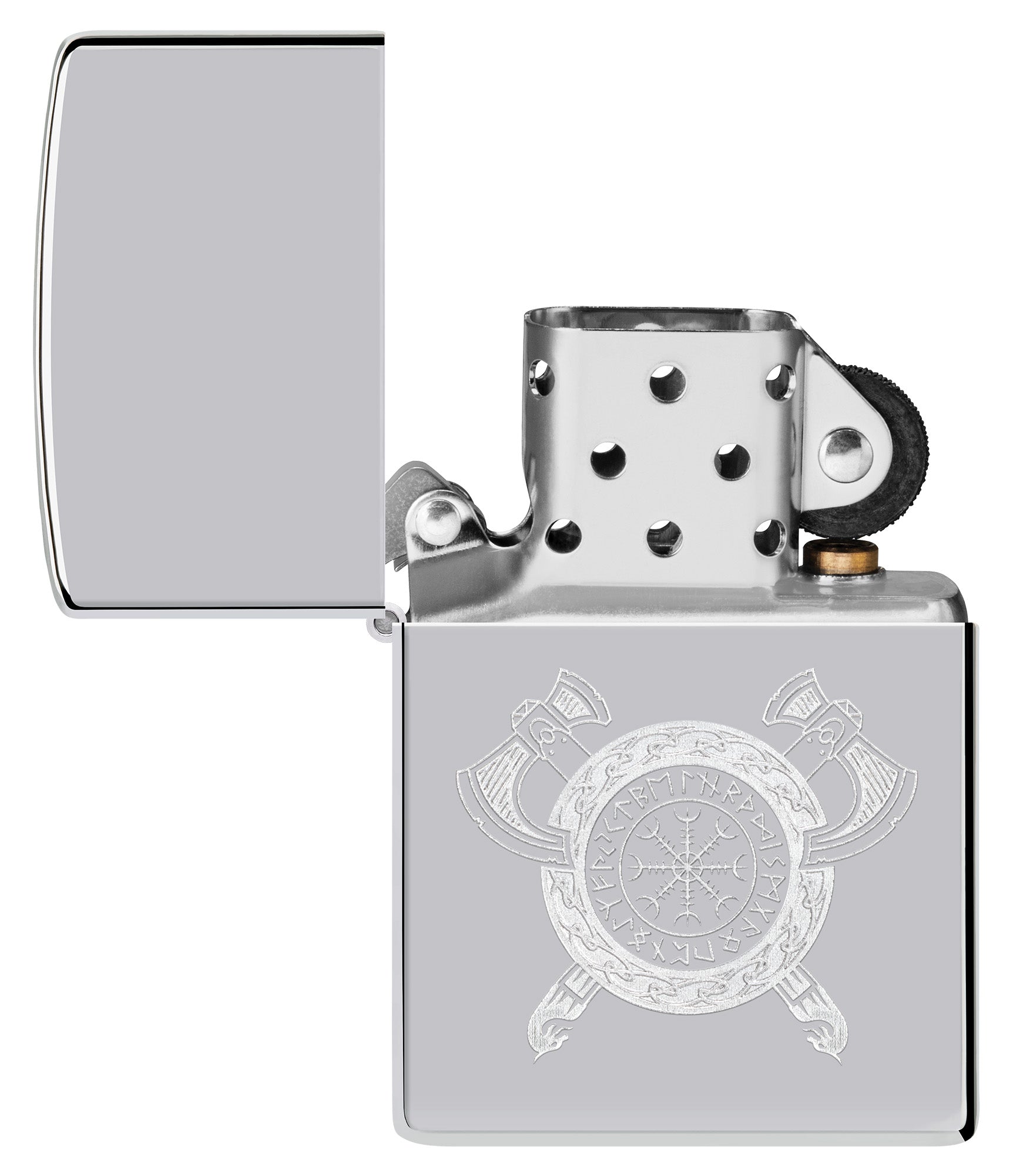 Op het oppervlak van deze klassieke aansteker van hoogglans chroom is, geflankeerd door twee bijlen, een gedetailleerd vikingschild te zien in een gedetailleerd ontwerp met dubbele glans.