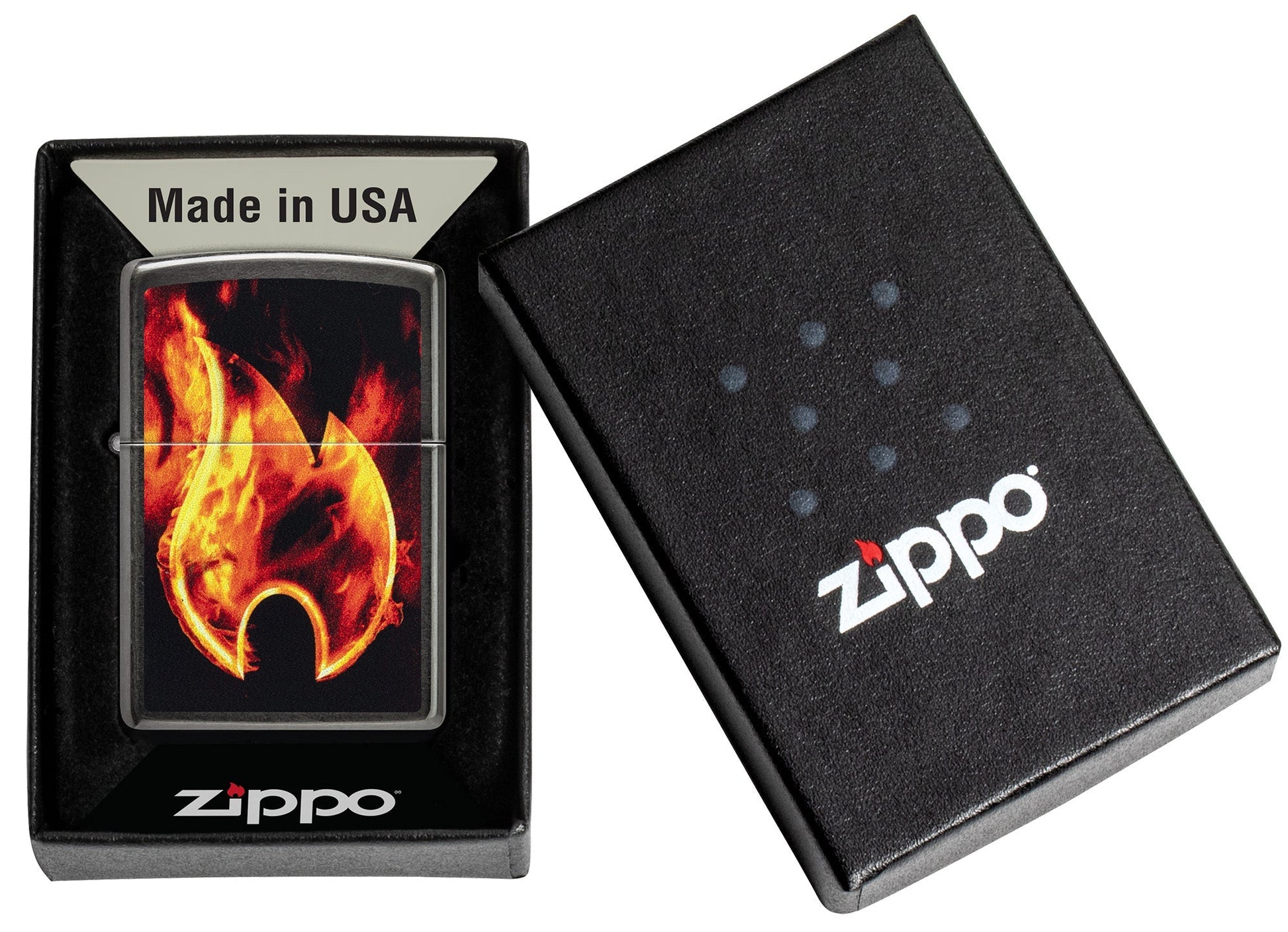 Voeg met deze aansteker in klassiek grijs een vurige vonk aan je collectie toe. Het pictogram met de Zippo-vlam is in vuur gedompeld in heldere kleuren.