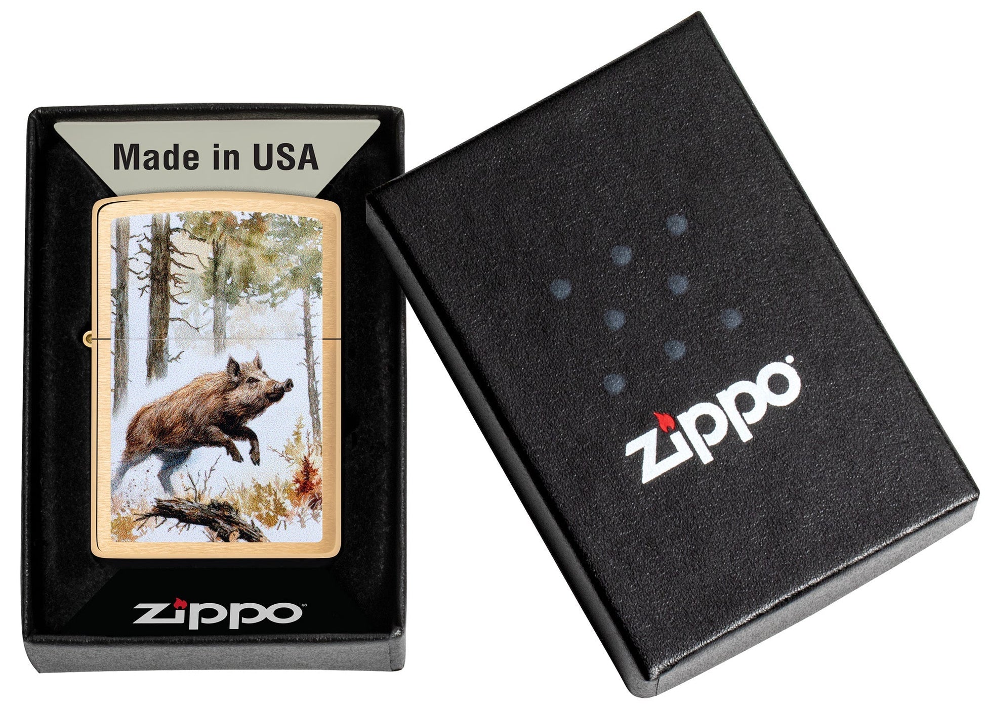 Het wilde zwijn is een van de zoogdieren met het grootste verspreidingsgebied ter wereld en staat wereldwijd bekend om zijn kracht, intelligentie en snelheid. Deze klassieke aansteker van geborsteld messing toont het beruchte dier dat door het bos trekt in een ontwerp met heldere kleuren.