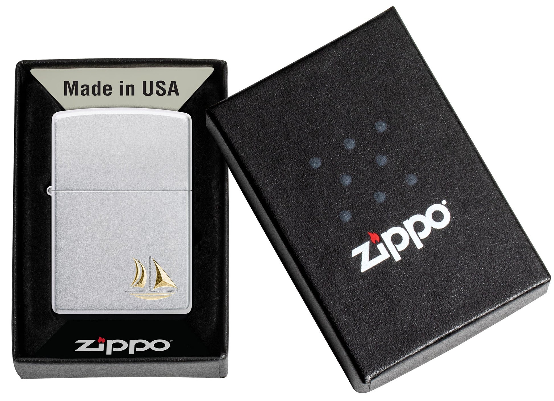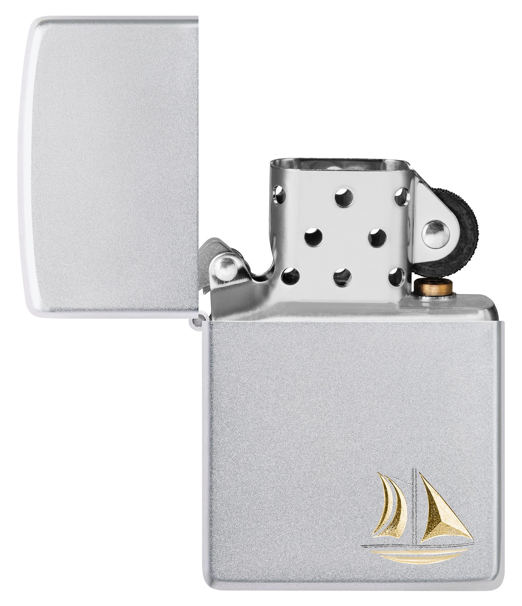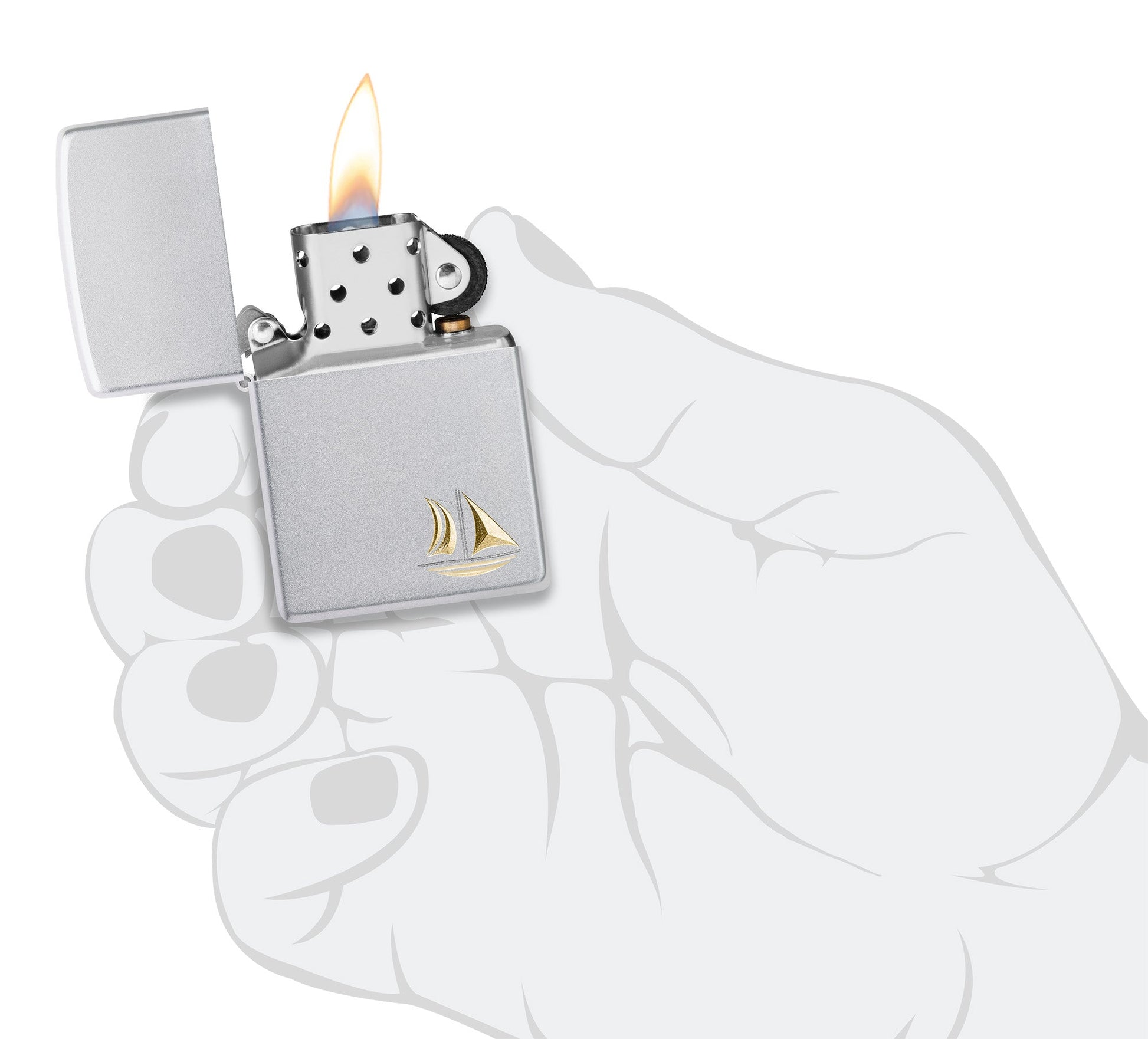 Neem je avontuurlijke instelling overal mee naartoe met deze klassieke aansteker van gesatineerd chroom. Een eenvoudige zeilboot verankert het verder lege oppervlak in een elegant Auto Two-Tone-ontwerp.