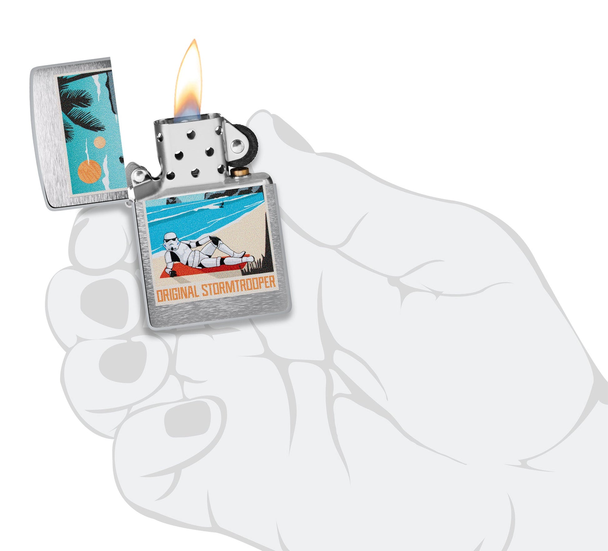 De iconische Original Stormtrooper, misschien wel de meest herkenbare strijdmacht in het heelal, komt perfect tot zijn recht op deze klassieke Brushed Chrome-aansteker. Het opvallende Color Image-ontwerp toont een geliefde Stormtrooper die ontspannen op het strand ligt.