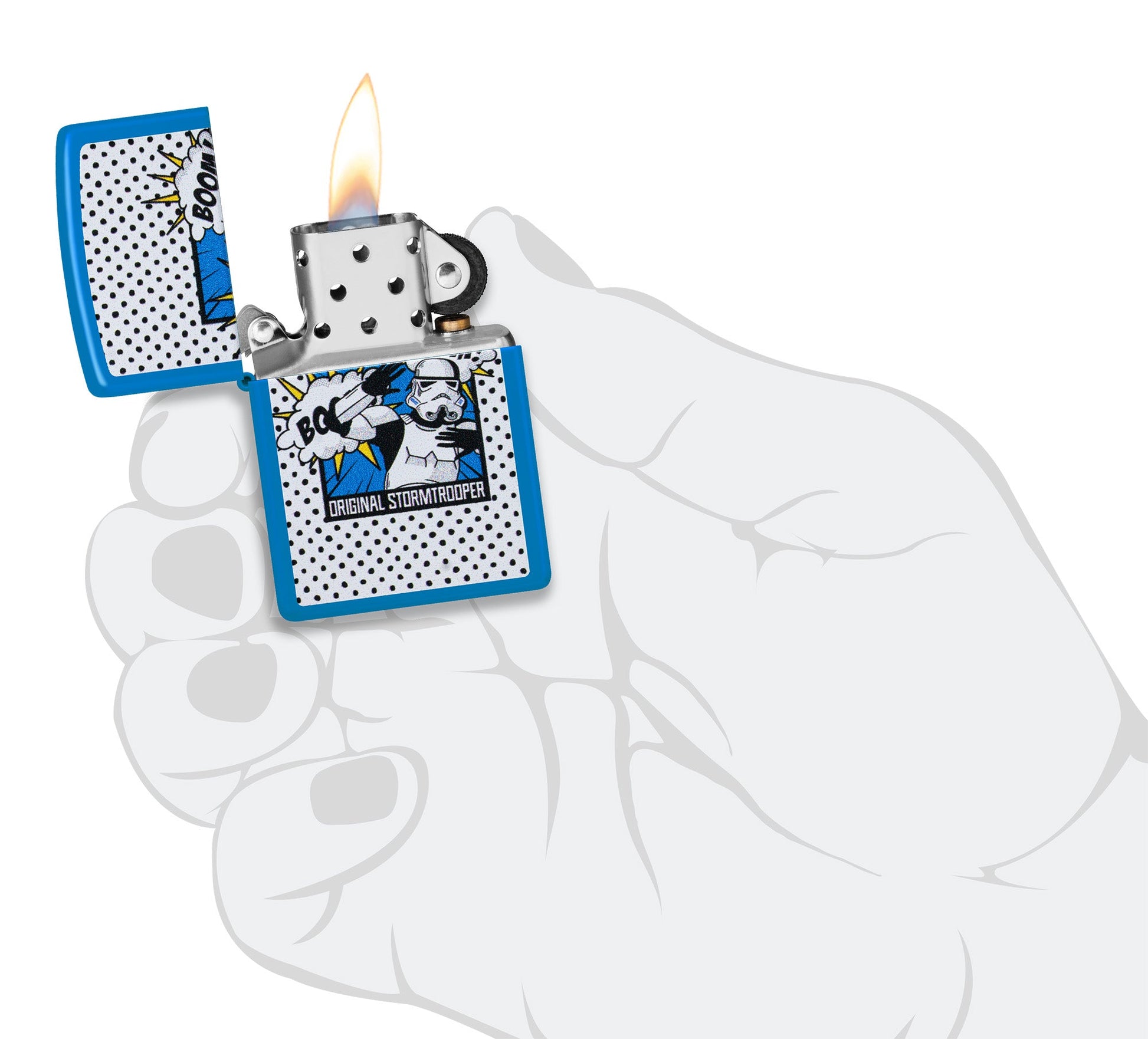 In dit ontwerp van Original Stormtrooper ontwijkt een geliefde soldaat explosies op het oppervlak van deze klassieke Sky Blue Matte-aansteker, uitgevoerd in een op strips geïnspireerd Color Image-ontwerp.