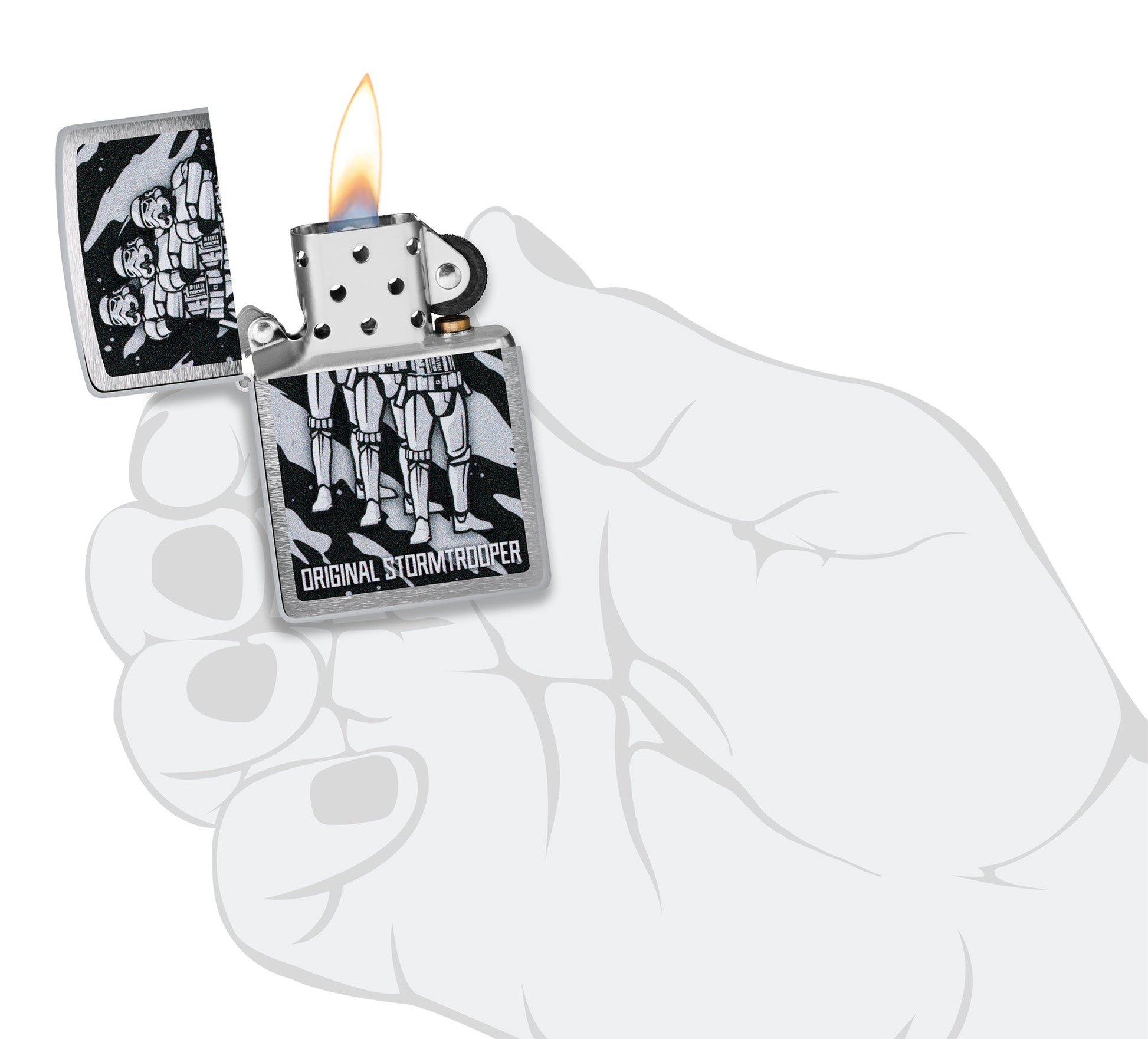 De iconische Original Stormtrooper, misschien wel de meest herkenbare strijdmacht in het heelal, komt perfect tot zijn recht op deze klassieke Brushed Chrome-aansteker. Een volledig squadron van de geliefde Troopers staat klaar om hun orders uit te voeren in het gedurfde Color Image-ontwerp.