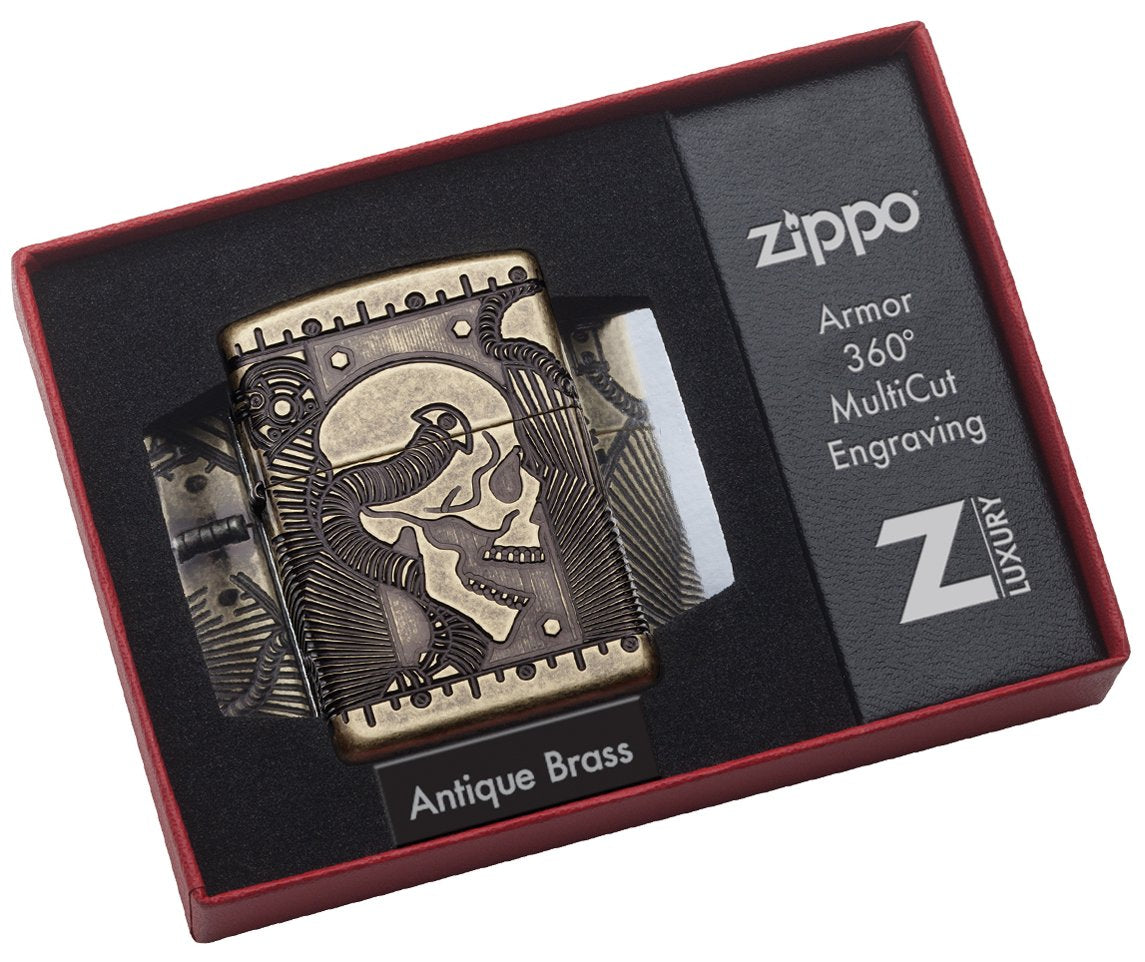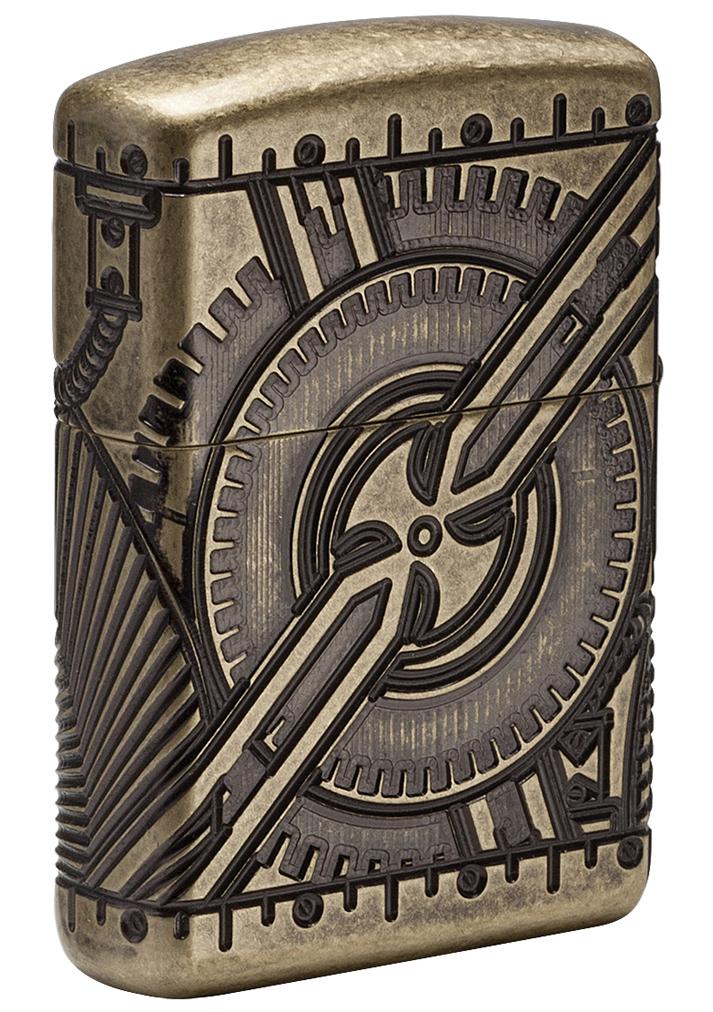 Deze Armor® Antique Brass-aansteker is het resultaat van een 360° MultiCut graveerproces, waarbij er is gegraveerd tot aan de rand, over de rand en rond de hele aansteker. De afwerking van antieke messing accentueert de verweerde look van het steampunkontwerp. Wordt geleverd in een geschenkdoos. Vul met de Zippo-aanstekervloeistof voor optimale prestaties.